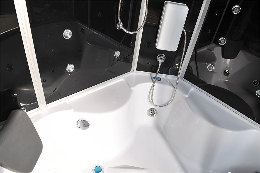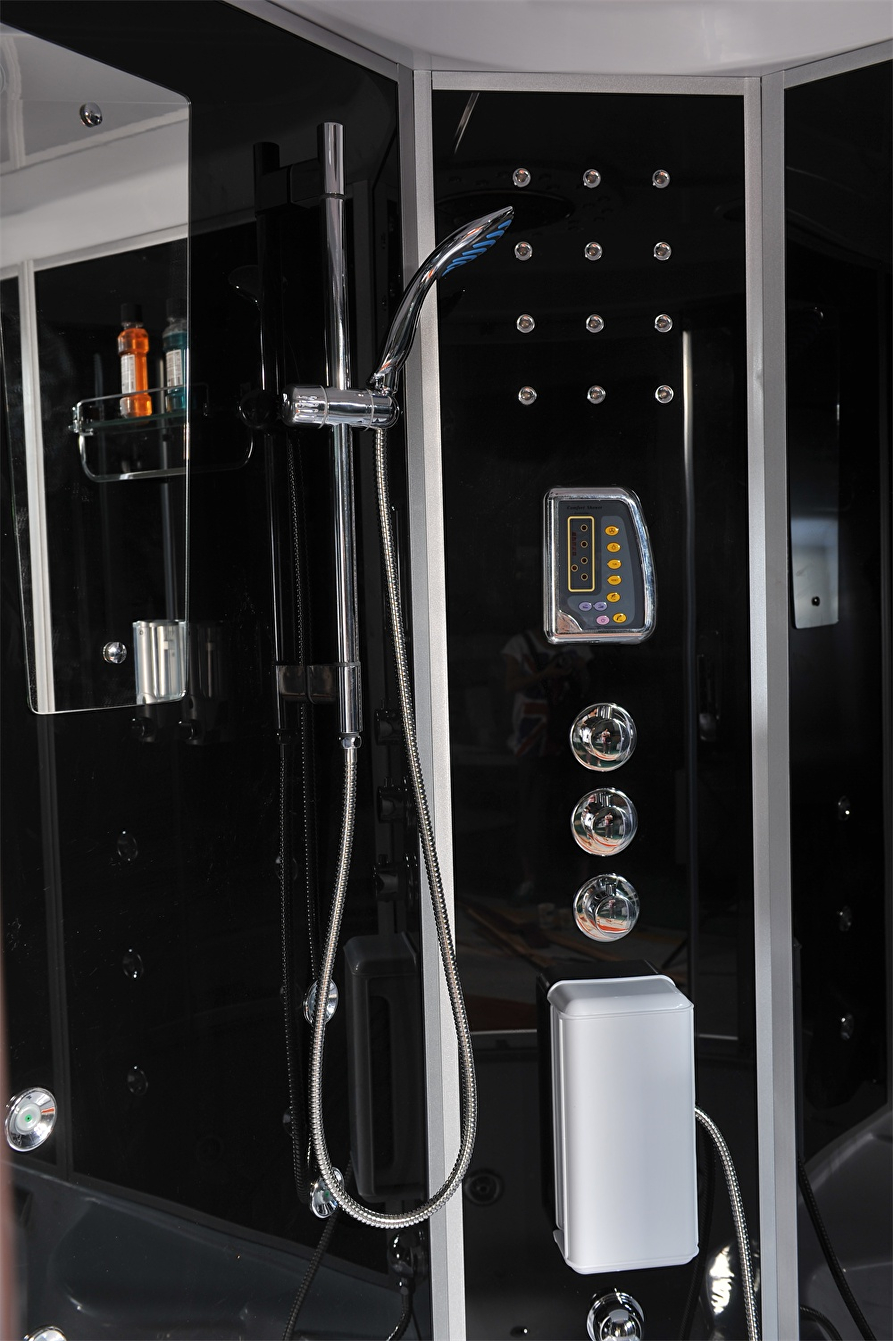 • Voorzien van: Veiligheidsglas wat zorgt voor extra veiligheid in de stoomcabine. Dankzij het veiligheidsglas hoef u zich nooit zorgen te maken over scherven op de vloer want het is stootbestendig en sterk. Mocht het toch gebeuren dat het glas barst, dan zal het uiteenvallen in onscherpe stukjes. - 2 schuifdeuren met rolmechanisme - Bad hoogte is circa 60CM en is voorzien van een instaptrede en hoofdsteunen - 4 grote watermassagejets in het bad - Uitgebreid control panel - Aromatherapie: vul de aromahouder met uw favoriete aroma’s zoals het welbekende eucalyptus om heerlijke geuren te verspreiden tijdens het stomen - Speaker met mogelijkheid tot inpluggen van uw telefoon - Spiegel - Handdoekrek met zeep en shampoo planchet - Ventilator - Handdouche - Regendouche in het plafond met sterrenverlichting rondom - Sfeerverlichting in middenkolom - Functie voor een aangename voetmassage - Ozone desinfectie voor het desinfecteren van uw stoomcabine na gebruik - Spiegelende glazen achterwanden - Cabine staat op verstelpoten die eenvoudig te stellen zijn in hoogte