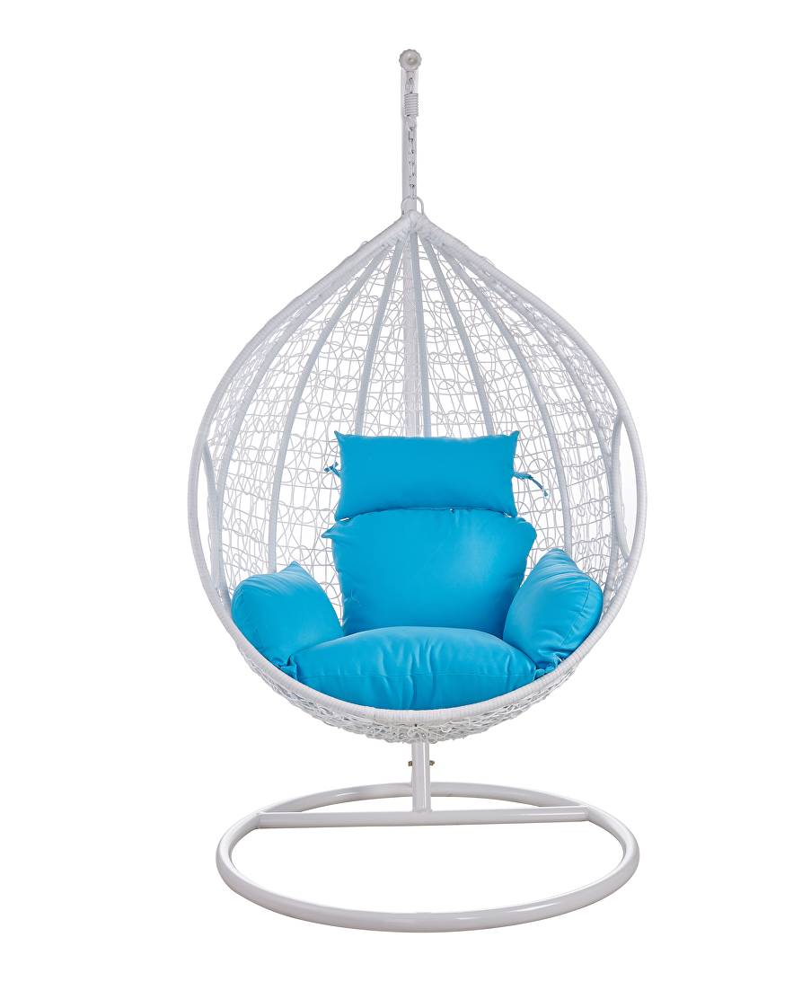 Ontspan in stijl met de CloudSwing hangstoel. Luxueus en van topkwaliteit. Witte hangstoel met blauwe kussens. Geniet van comfort en elegantie.
