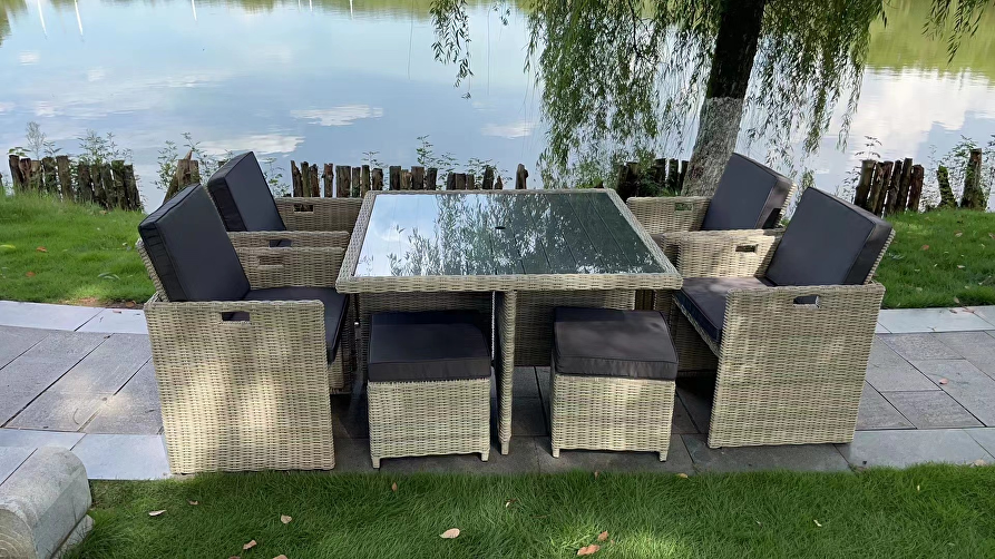 • Kleur: Lichtgrijs wicker met zwarte kussens