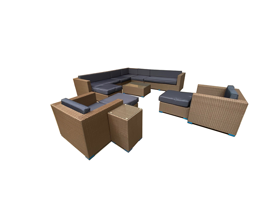 • Kleur: Nutellabruin wicker met marineblauwe kussens
