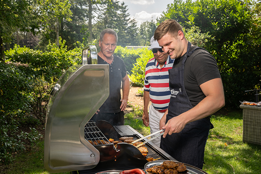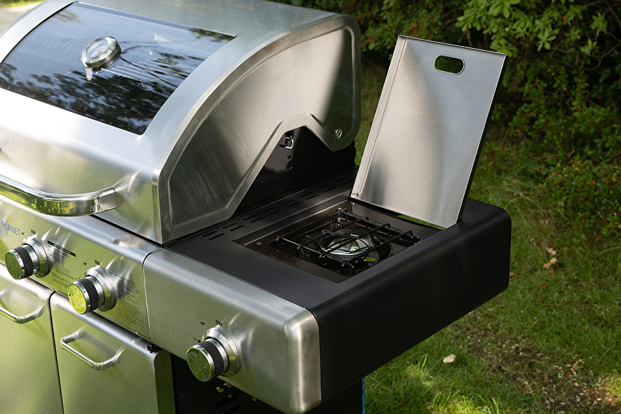• Voorzien van:  3 Hoofdbranders en 1 zijbrander - Gietijzeren rooster - Gietijzeren kookplaat - Elektrische ontsteking - Deksel voorzien van thermometer en glazen venster - Wieltjes waarvan 2 met rem  - Twee deuren.