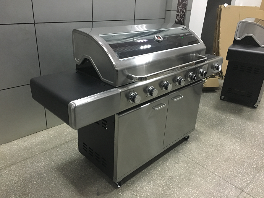 • Voorzien van:  6 Hoofdbranders en 1 zijbrander - Gietijzeren rooster - Gietijzeren kookplaat - Elektrische ontsteking - Deksel voorzien van thermometer en glazen venster - Wieltjes waarvan 2 met rem  - Twee deuren.