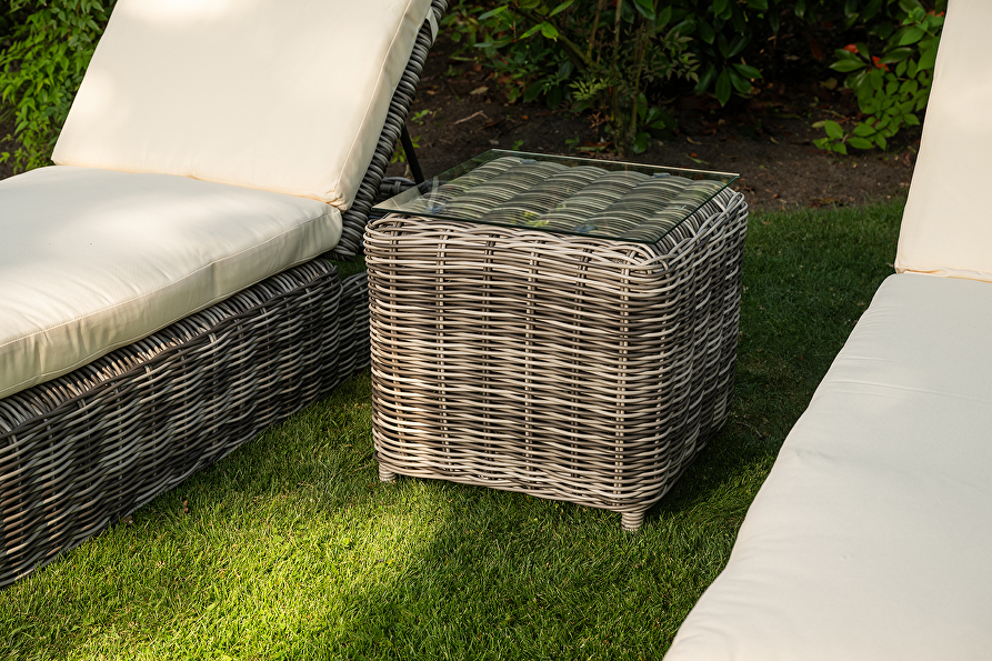 3. Bijzettafel: aluminium frame met vlechtwerk en gehard glas