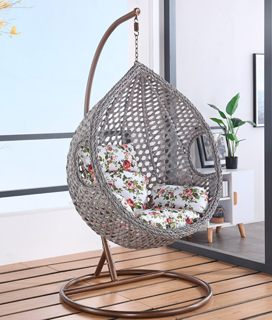 "Geniet van pure luxe en comfort in de LoungeNest hangstoel. Met zijn grijze kleur, prachtig witte kussens met print en hoogwaardige materialen, creëert deze hangstoel een oase van elegantie. Met afmetingen van 108x75x125cm, een 200cm hoge pole en een 105cm brede basis, biedt dit model de perfecte balans tussen stijl en functionaliteit. Gemaakt van polyetheen rotan en een aluminium frame met metaal gepoedercoat, zorgen voor duurzaamheid en solide constructie. De waterdichte kussens met schuim bieden een zachte en luxueuze zitervaring. LoungeNest, voor een leven vol elegantie en comfort."