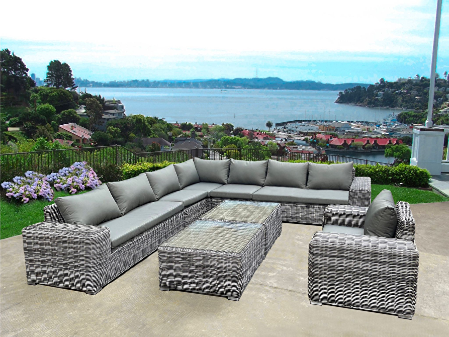 1. Set bestaat uit 2 dubbele zitplaatsen, 1 loungestoel, 2 middelste zitplaatsen, 1 hoekzitplaats en 2 tafels.