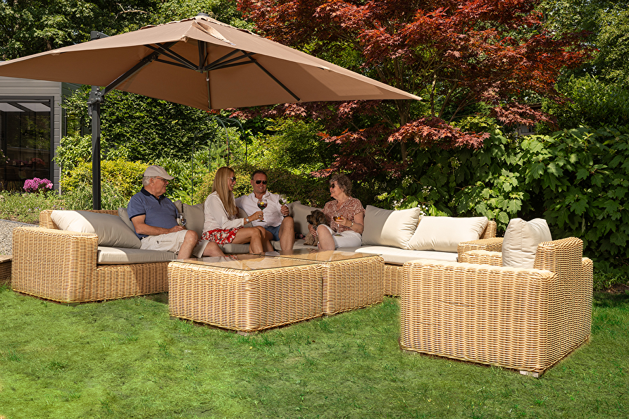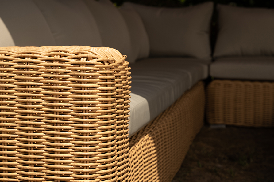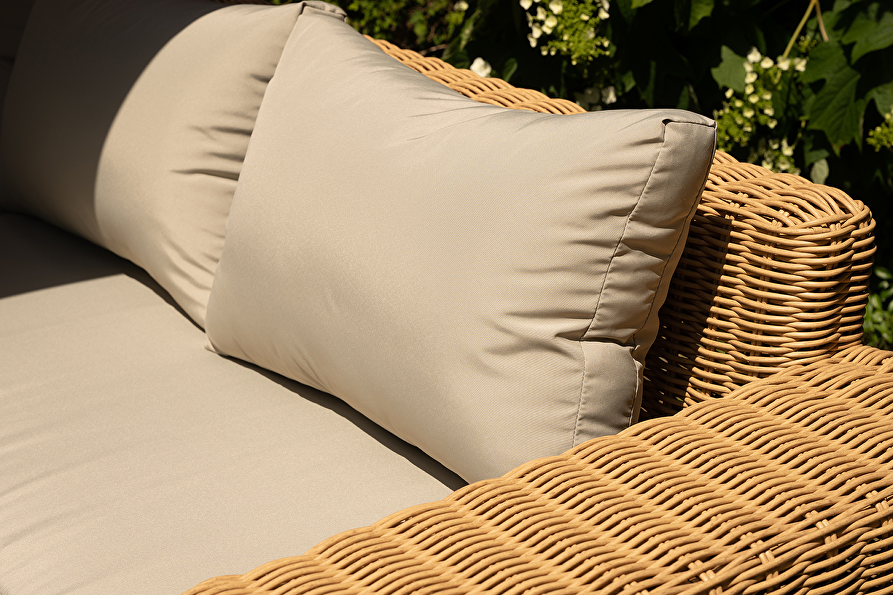 - Kleur: Lichtbruin wicker met lichtgrijze kussens