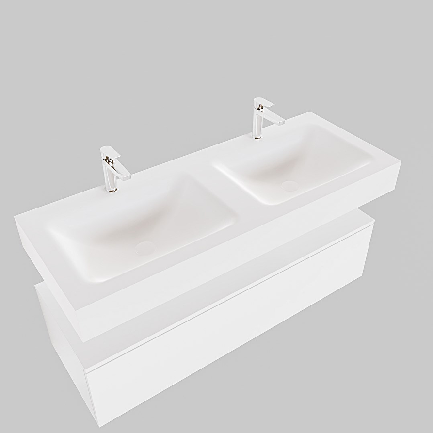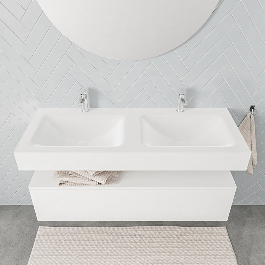 Breedte onderkast: ca. 120 cm Hoogte onderkast: ca. 30 cm Diepte onderkast: ca. 41 cm Kleur onderkast: Talc Materiaal onderkast: MDF Aantal lades: 1 Type geleider: Push to open Breedte wastafel: 120 cm Hoogte wastafel: 12 cm Diepte wastafel: 46 cm Kleur wastafel: Talc Materiaal wastafel: Solid surface Positie wasbak: Dubbel Breedte spoelbak: 47 cm Aantal spoelbakken: 2 Aantal kraangaten: 2 Producent: Mondiaz Antibacterieel: Ja Maatwerk mogelijk: Ja Inclusief sifon: Nee Dit badmeubel is mooi te combineren met: