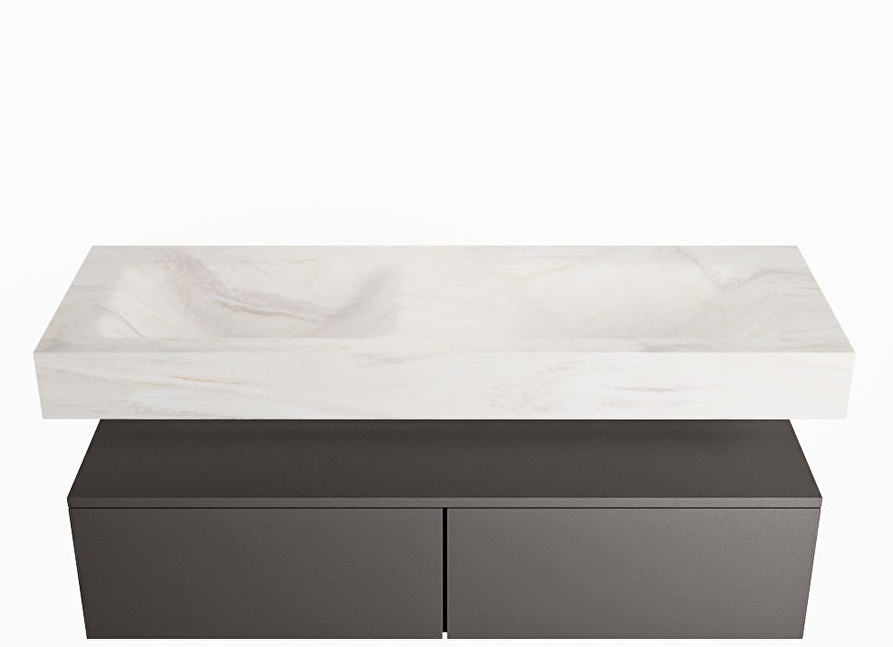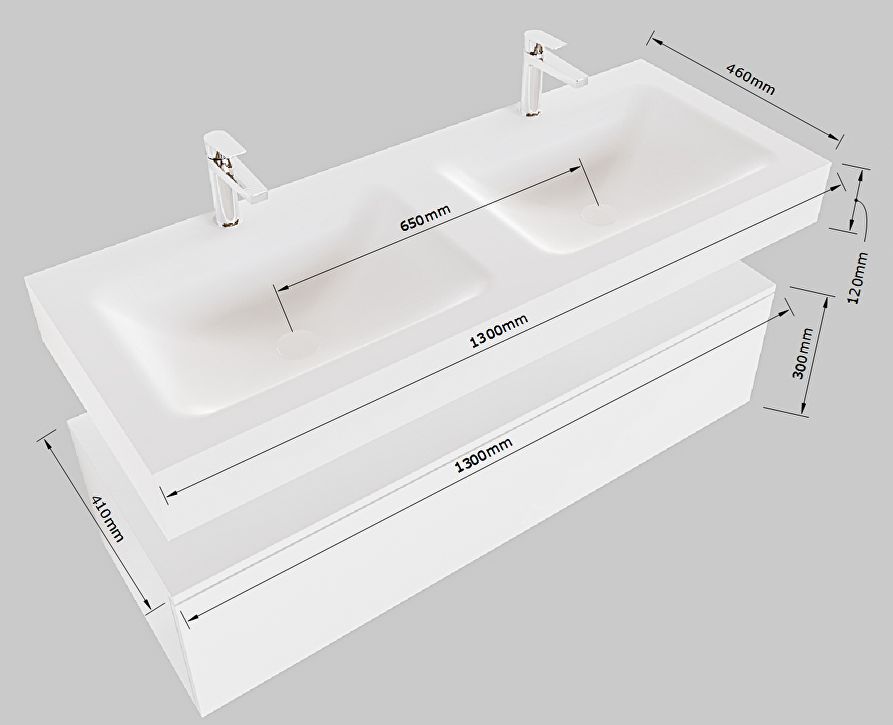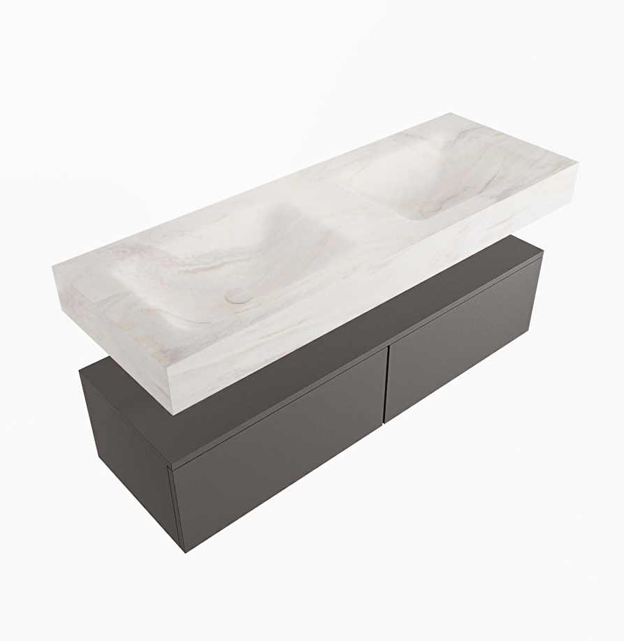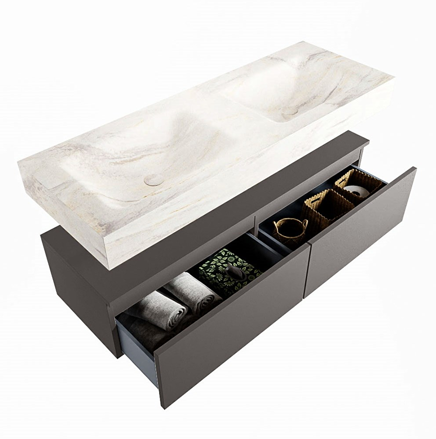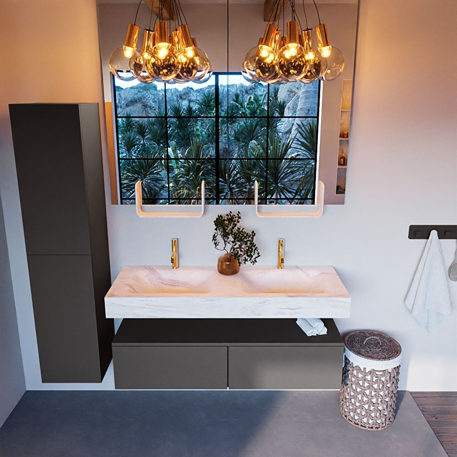 Breedte onderkast: 130 cm Hoogte onderkast: 30 cm Diepte onderkast: 41 cm Kleur onderkast: Dark Grey Materiaal onderkast: MDF Aantal lades: 2 Type geleider: Push to open Breedte wastafel: 130 cm Hoogte wastafel: 12 cm Diepte wastafel: 46 cm Kleur wastafel: Ostra Materiaal wastafel: Solid surface Positie wasbak: Dubbel Breedte spoelbak: 47 cm Aantal spoelbakken: 2 Aantal kraangaten: 2 Producent: Mondiaz Antibacterieel: Ja Maatwerk mogelijk: Ja Inclusief sifon/plug: Nee Deze badmeubelset is mooi te combineren met: