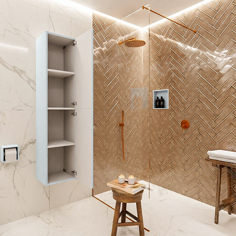 De BEAM 160 cm badkamerkast met twee push-to-open deuren is een veelzijdige toevoeging aan elke badkamer. Deze kolomkast biedt flexibiliteit, omdat je zelf kunt kiezen of je de deuren links of rechts wilt plaatsen. Dankzij de extra opbergruimte van de BEAM badkamerkast blijft alles netjes opgeruimd, zodat je volop kunt genieten van de rust en wellness in jouw badkamer.