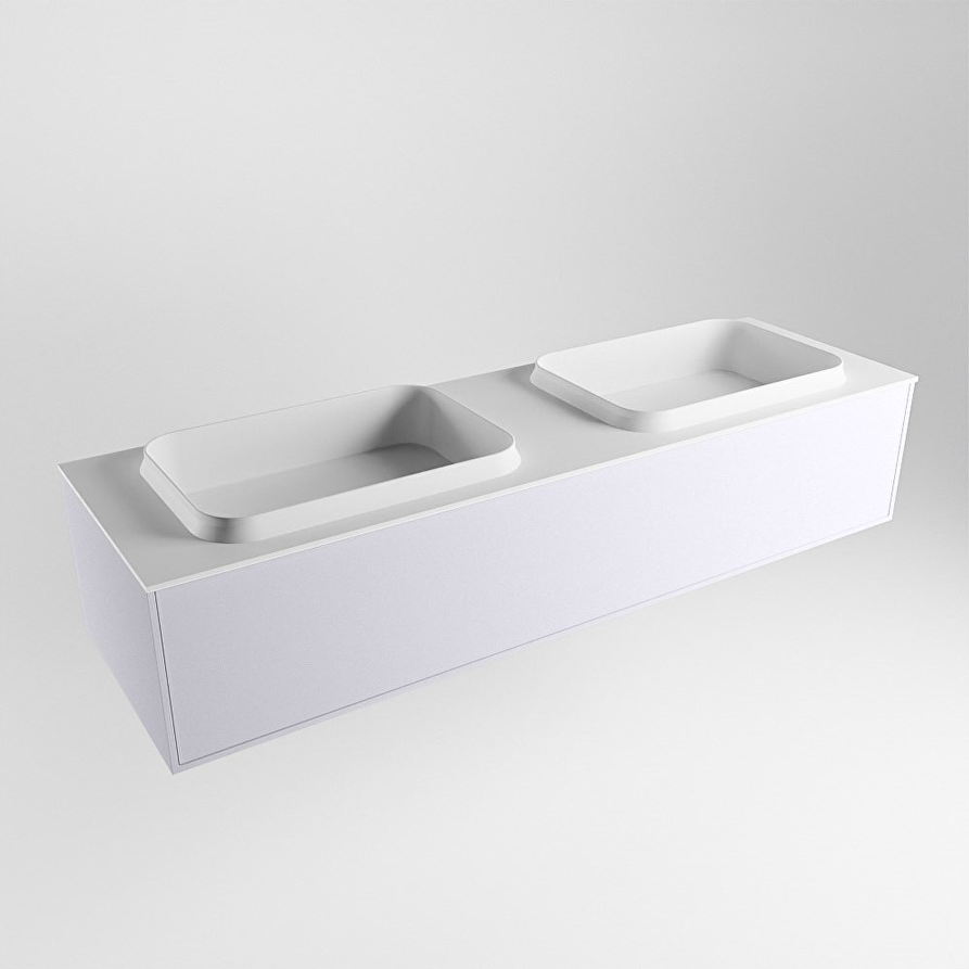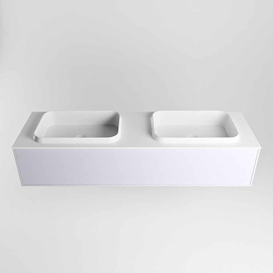 Breedte onderkast: ca. 150 cm Hoogte onderkast: ca. 30 cm Diepte onderkast: ca. 45,5 cm Kleur onderkast: Cale Materiaal onderkast: MDF Aantal lades: 1 Type geleider: Push to open Breedte wastafel: 151 cm Hoogte wastafel: 0,9 cm Diepte wastafel: 46 cm Kleur wastafel: Talc Materiaal wastafel: Solid Surface Positie wasbak: Dubbel Aantal spoelbakken: 2 Aantal kraangaten: 2 Producent: Mondiaz Antibacterieel: Ja Maatwerk mogelijk: Ja Inclusief sifon: Nee Deze badmeubelset is mooi te combineren met: