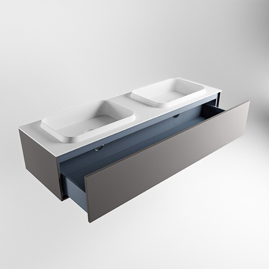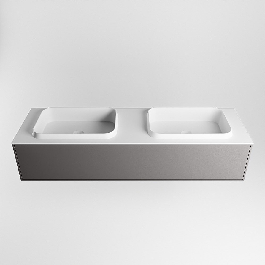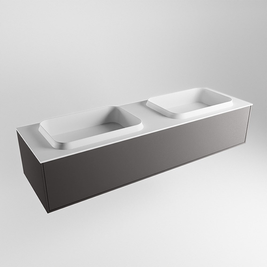 Breedte onderkast: ca. 150 cm Hoogte onderkast: ca. 30 cm Diepte onderkast: ca. 45,5 cm Kleur onderkast: Dark Grey Materiaal onderkast: MDF Aantal lades: 1 Type geleider: Push to open Breedte wastafel: 151 cm Hoogte wastafel: 0,9 cm Diepte wastafel: 46 cm Kleur wastafel: Talc Materiaal wastafel: Solid Surface Positie wasbak: Dubbel Aantal spoelbakken: 2 Aantal kraangaten: 2 Producent: Mondiaz Antibacterieel: Ja Maatwerk mogelijk: Ja Inclusief sifon: Nee Deze badmeubelset is mooi te combineren met: