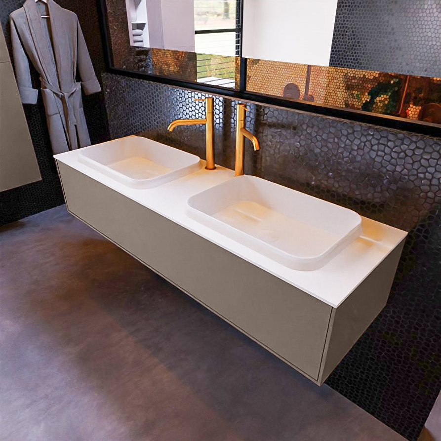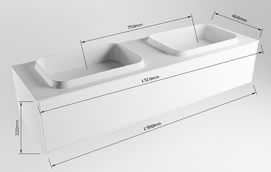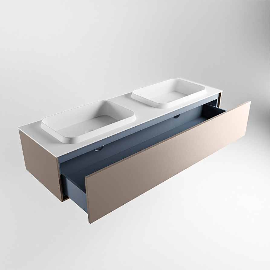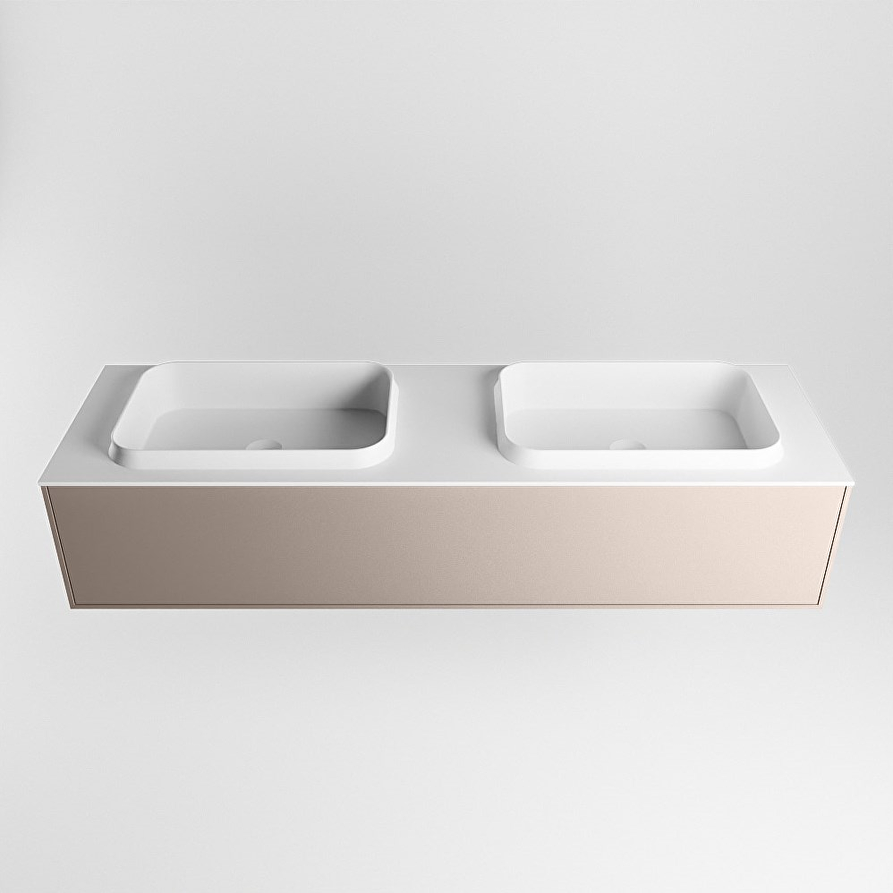 Breedte onderkast: ca. 150 cm Hoogte onderkast: ca. 30 cm Diepte onderkast: ca. 45,5 cm Kleur onderkast: Smoke Materiaal onderkast: MDF Aantal lades: 1 Type geleider: Push to open Breedte wastafel: 151 cm Hoogte wastafel: 0,9 cm Diepte wastafel: 46 cm Kleur wastafel: Talc Materiaal wastafel: Solid Surface Positie wasbak: Dubbel Aantal spoelbakken: 2 Aantal kraangaten: 2 Producent: Mondiaz Antibacterieel: Ja Maatwerk mogelijk: Ja Inclusief sifon: Nee Deze badmeubelset is mooi te combineren met: