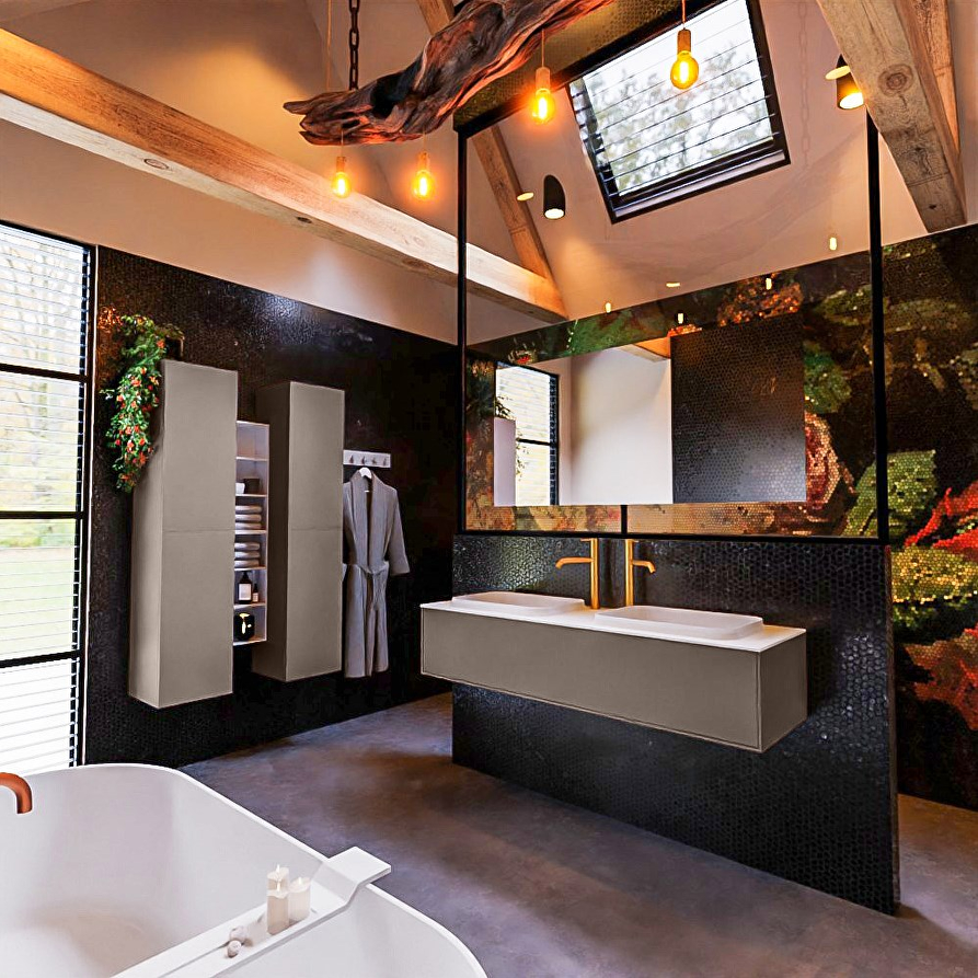 Een badkamermeubel is geschikt voor vochtige ruimtes, maar het is belangrijk dat er geen direct water of condens langs het meubel loopt. Een badmeubel kan tegen vocht, maar niet tegen water. Om het meubel in goede staat te houden: