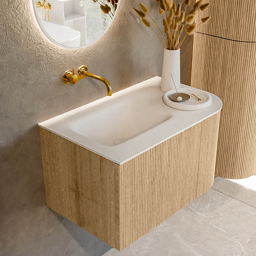 Breedte onderkast: ca. 75 cm Hoogte onderkast: ca. 40 cm Diepte onderkast: ca. 46 cm Kleur onderkast: Oak Materiaal fronten & zijkanten: Massief eiken & multiplex/fineer eiken Materiaal geraamte: Melamine Aantal lades: 1 Aantal deuren: 1 Type geleider: Push to open Breedte wastafel: 76 cm Hoogte wastafel: 0,9 cm Diepte wastafel: 47 cm Kleur wastafel: Talc Materiaal wastafel: Solid surface Positie wasbak: Links Breedte spoelbak: 38 cm Aantal spoelbakken: 1 Aantal kraangaten: 0 Producent: Mondiaz Antibacterieel: Ja Maatwerk mogelijk: Ja Inclusief sifon: Nee Deze badmeubelset is mooi te combineren met: