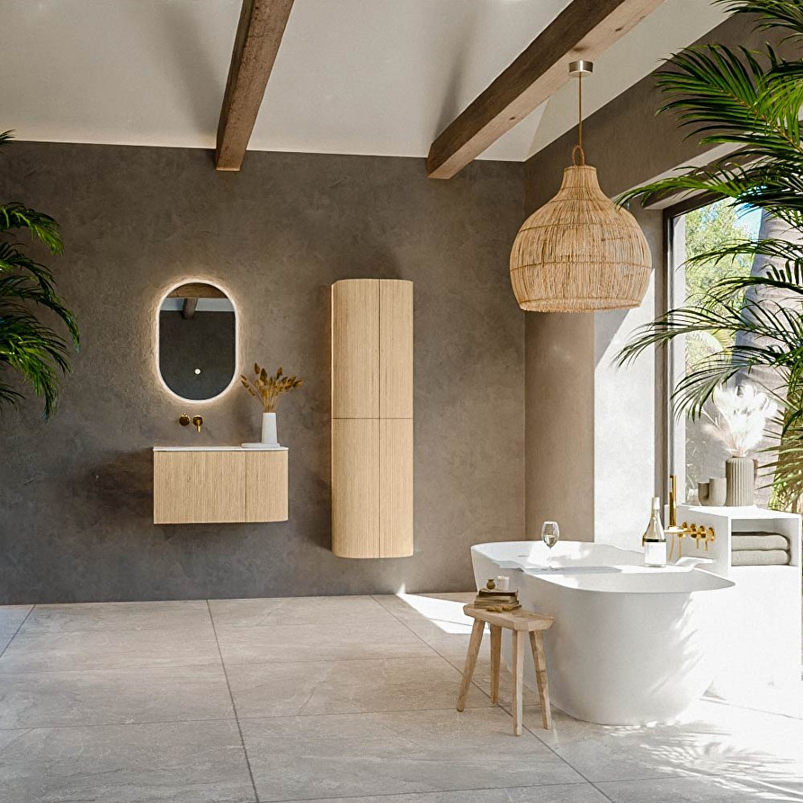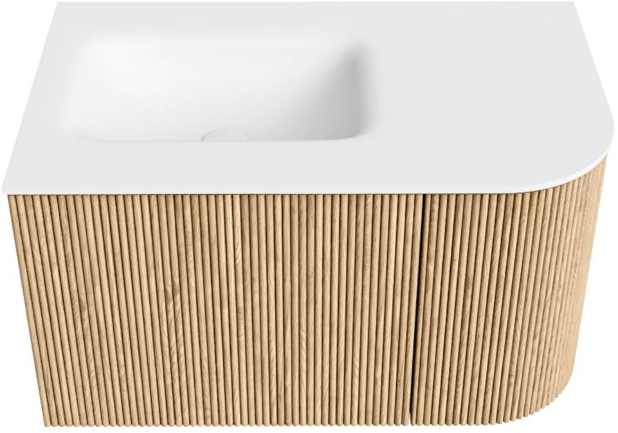 Het ultieme badmeubel dat je badkamer transformeert tot een oase van verfijning. Met halfronde, verticale stroken van massief eiken in de kleuren Oak en Walnut, straalt KURVE vakmanschap uit in elk detail. De zachte rondingen en slim ontworpen deurtjes, elk 40 cm hoog, nodigen uit tot gebruik, terwijl de ruimte optimaal wordt benut door de royale lade van dezelfde hoogte.