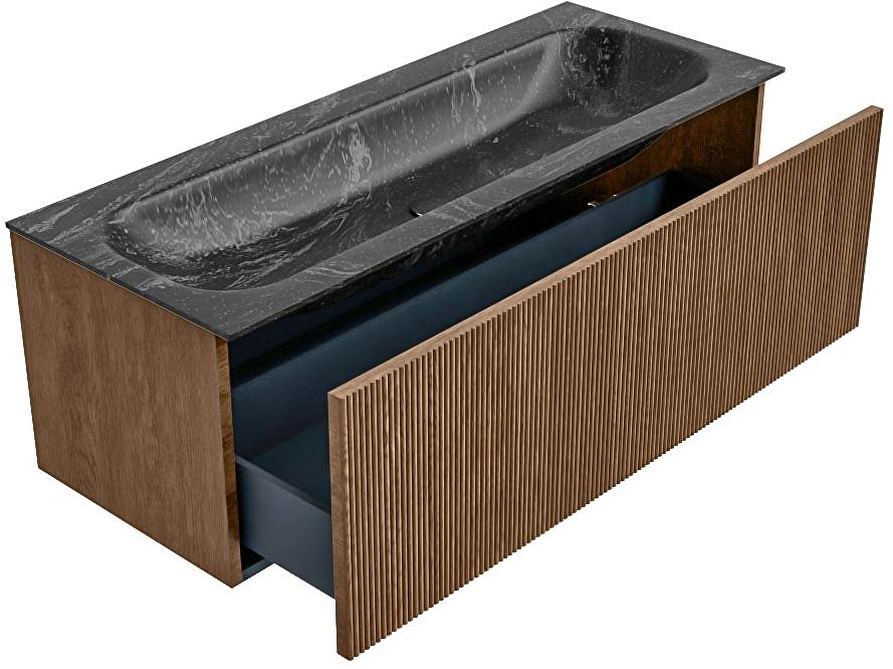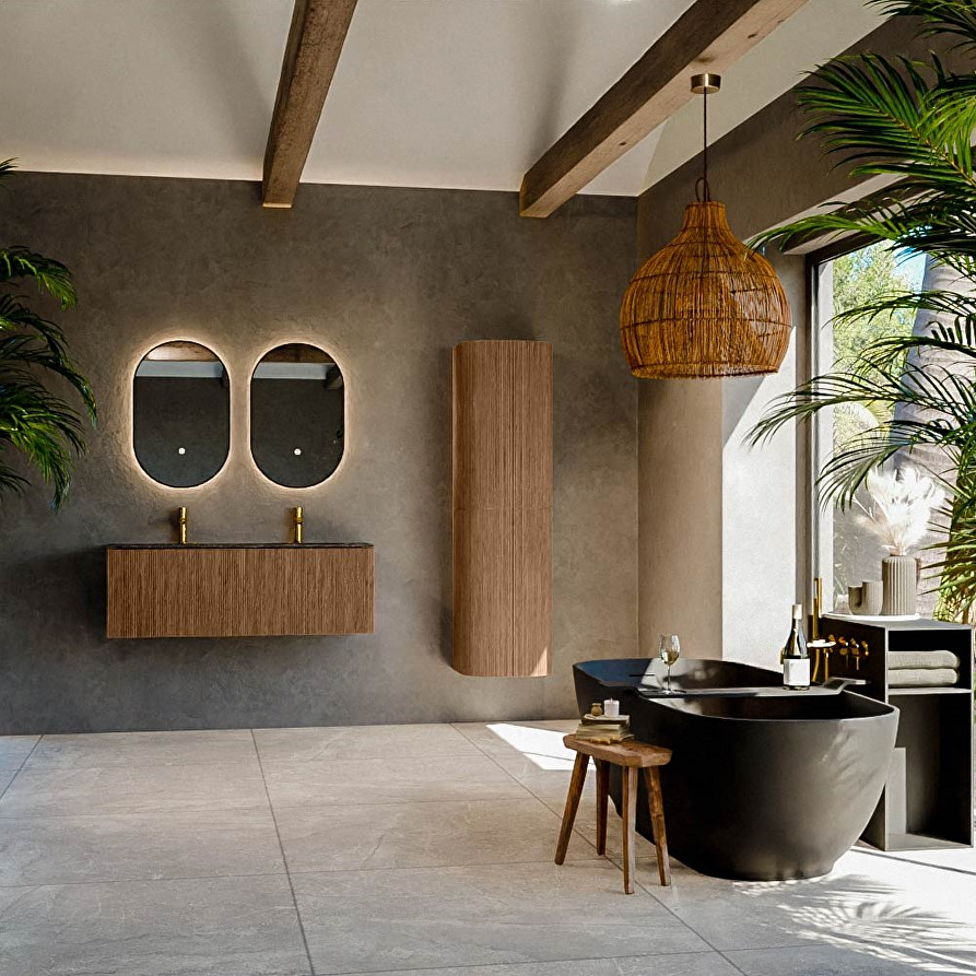 Het ultieme badmeubel dat je badkamer transformeert tot een oase van verfijning. Met halfronde, verticale stroken van massief eiken, verkrijgbaar in Oak en Walnut, straalt KURVE vakmanschap uit in elk detail. De zachte rondingen en slim ontworpen deurtjes (40 cm hoog) nodigen uit tot gebruik, terwijl de royale lade van dezelfde hoogte zorgt voor optimaal ruimtegebruik.