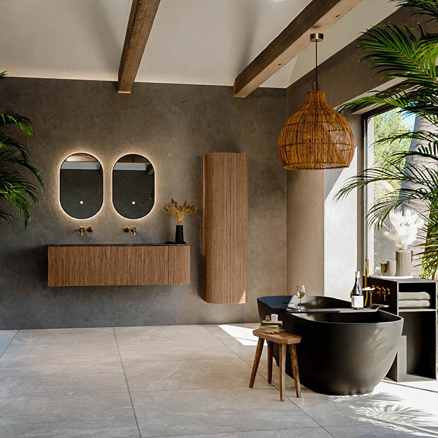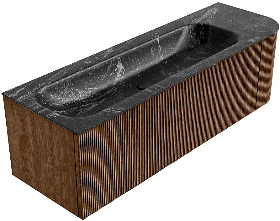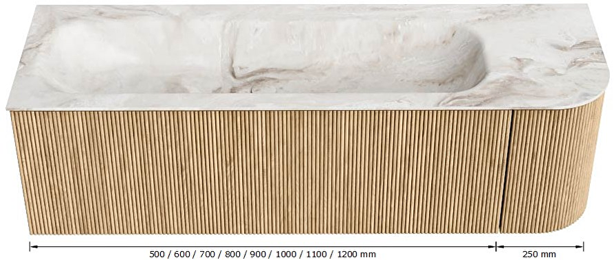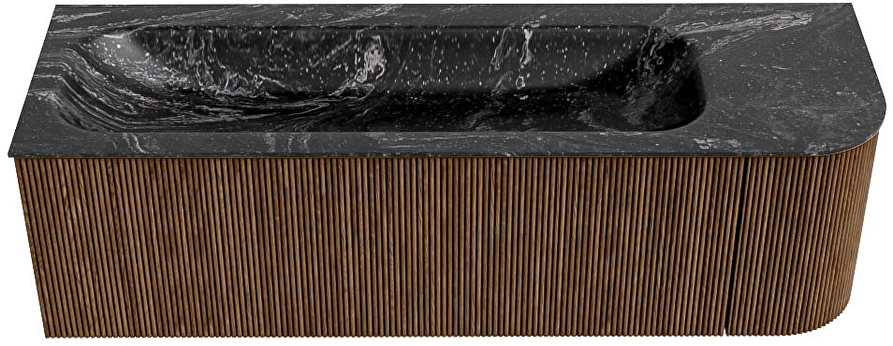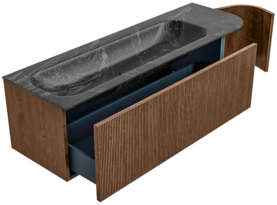 Het ultieme badmeubel dat je badkamer transformeert tot een oase van verfijning. Met zijn halfronde, verticale stroken van massief eiken, verkrijgbaar in de kleuren Oak en Walnut, straalt KURVE vakmanschap uit in elk detail. De zachte rondingen en slim ontworpen deurtjes, elk 40cm hoog, nodigen uit tot gebruik, terwijl de ruimte binnenin optimaal benut wordt dankzij de royale lade van dezelfde hoogte.