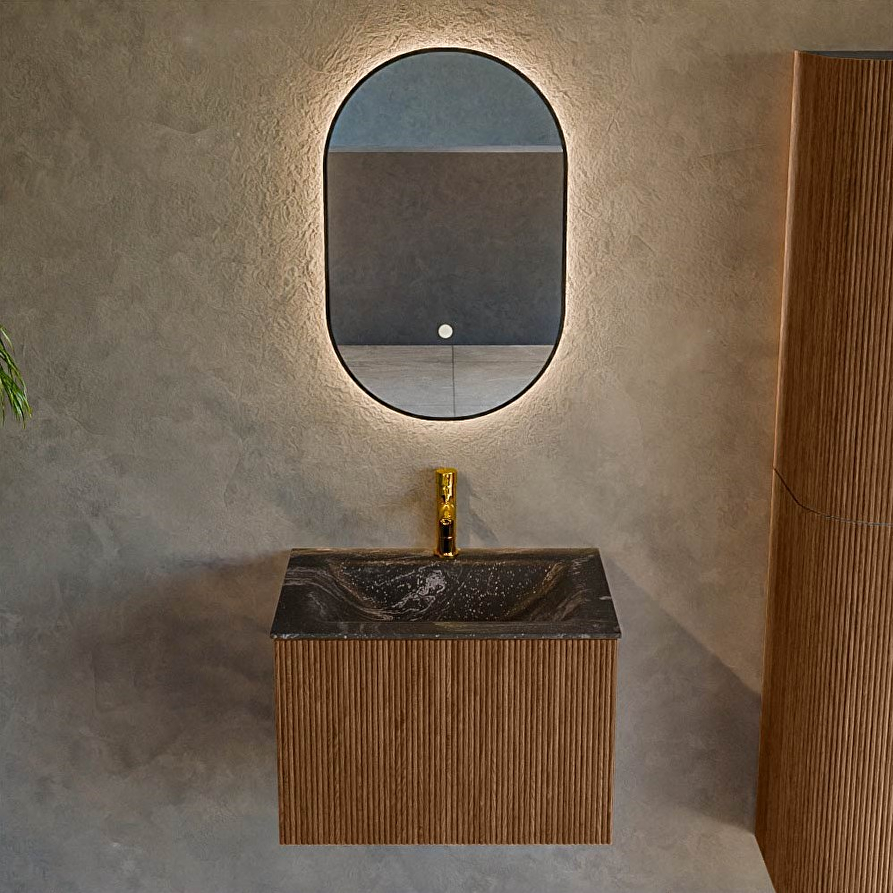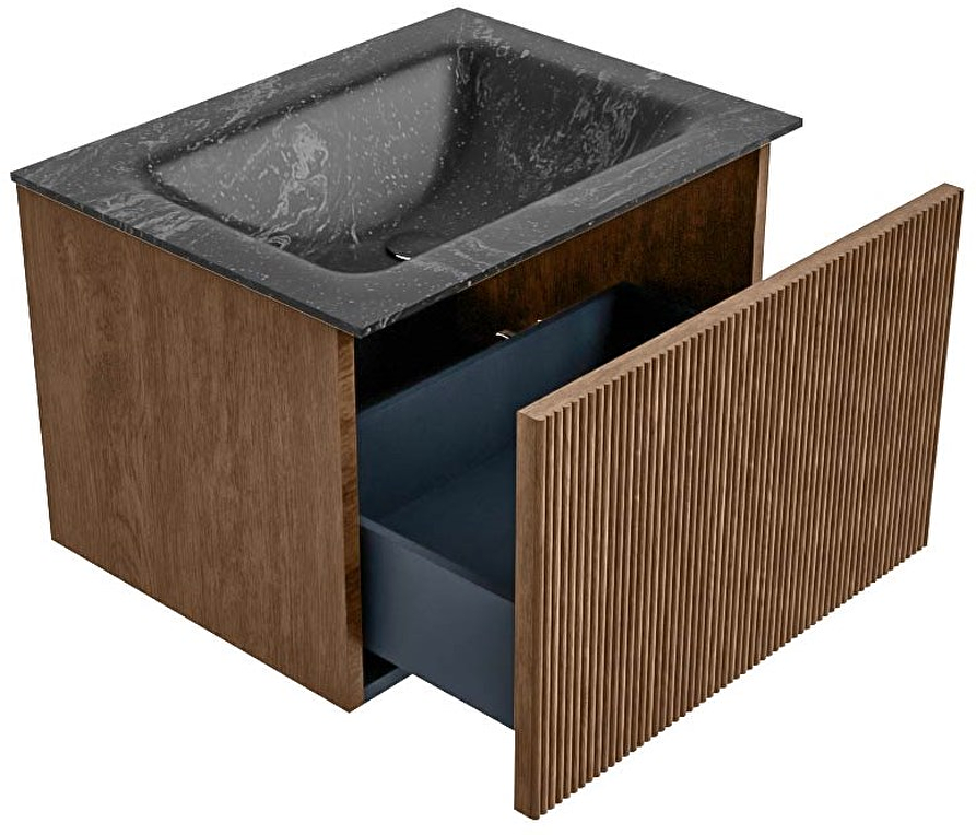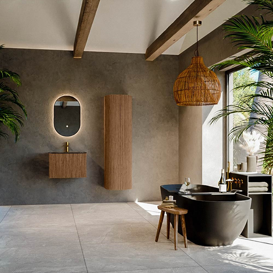 Het ultieme badmeubel dat je badkamer transformeert tot een oase van verfijning. Met zijn halfronde, verticale stroken van massief eiken, verkrijgbaar in de kleuren Oak en Walnut, straalt KURVE vakmanschap uit in elk detail. De zachte rondingen en slim ontworpen deurtjes, elk 40 cm hoog, nodigen uit tot gebruik, terwijl de ruimte binnenin optimaal benut wordt dankzij de royale lade van dezelfde hoogte.