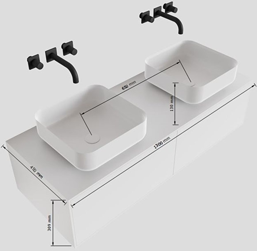 Breedte onderkast: ca. 130 cm Hoogte onderkast: ca. 30 cm Diepte onderkast: ca. 45 cm Kleur onderkast: Talc Materiaal onderkast: Solid surface Aantal lades: 2 Type geleider: Push to open Breedte waskom: 36 cm Hoogte waskom: 13 cm Diepte waskom: 36 cm Kleur waskom: Talc Materiaal waskom: Solid surface Positie waskom: Dubbel Aantal waskommen: 2 Aantal kraangaten: 0 Producent: Mondiaz Antibacterieel: Ja Maatwerk mogelijk: Ja Inclusief sifon: Nee Deze badmeubelset is mooi te combineren met: