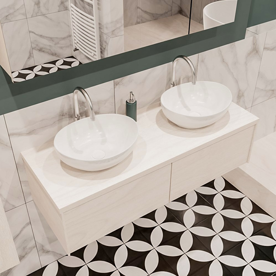 De LUSH meubelset is verkrijgbaar in vier prachtige melamine kleuren, die een warme en natuurlijke uitstraling toevoegen aan je badkamer. In de LUSH-serie heb je de keuze tussen 1 of 2 lades en kun je kiezen tussen een wastafel of waskom. Daarnaast is het mogelijk om te kiezen voor wel of geen kraangat en de positie van de wastafel of waskom. Deze serie biedt veelzijdige opties om het badmeubel aan te passen aan jouw specifieke behoeften en smaak.