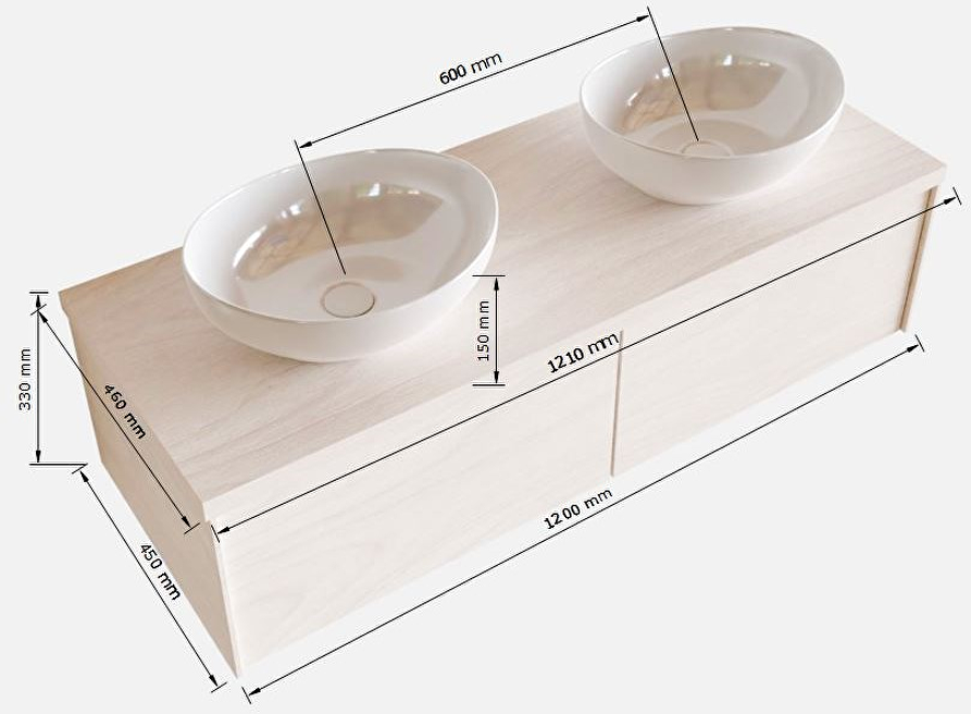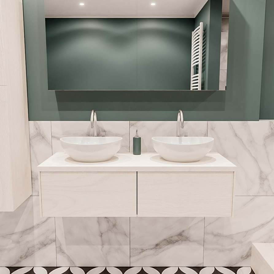 Breedte onderkast: ca. 120 cm Hoogte onderkast: ca. 30 cm Diepte onderkast: ca. 45 cm Kleur onderkast: Underlayment Materiaal onderkast: Melamine Aantal lades: 2 Type geleider: Push to open Breedte waskom: 41 cm Hoogte waskom: 14 cm Diepte waskom: 33 cm Kleur waskom: Glanzend wit Materiaal waskom: Keramiek Positie waskom: Dubbel Aantal waskommen: 2 Aantal kraangaten: 2 Producent: Mondiaz Antibacterieel: Ja Maatwerk mogelijk: Ja Inclusief sifon: Nee Deze badmeubelset is mooi te combineren met: