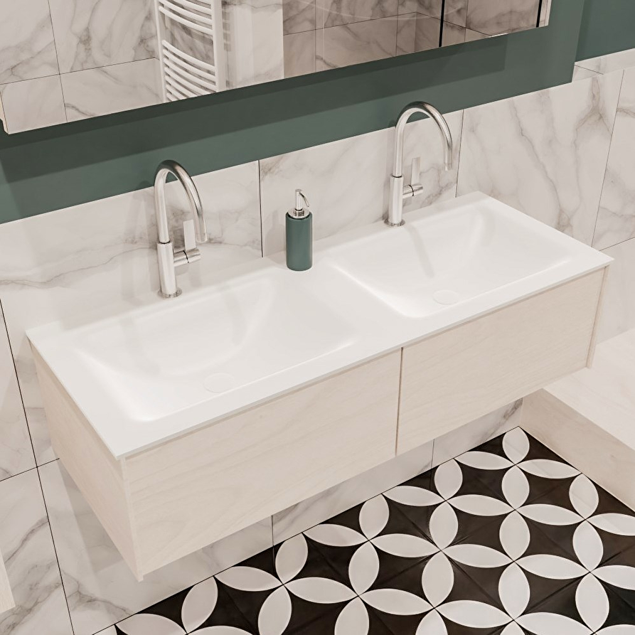 De LUSH meubelset is verkrijgbaar in 4 prachtige melamine kleuren, die een warme en natuurlijke uitstraling toevoegen aan je badkamer. In de LUSH serie heb je de keuze tussen 1 of 2 lades en kun je kiezen tussen een wastafel of waskom. Daarnaast is het mogelijk om te kiezen voor wel of geen kraangat en de positie van de wastafel/waskom. Deze serie biedt daarmee veelzijdige opties om het badmeubel aan te passen aan jouw specifieke behoeften en smaak.