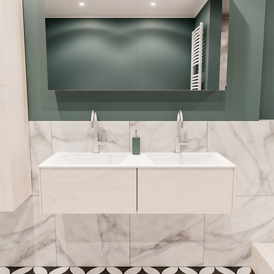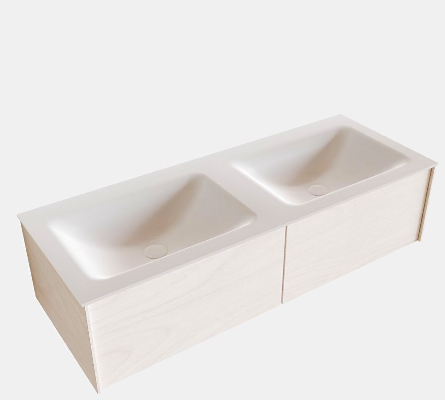 Breedte onderkast ca: 120cm Hoogte onderkast ca: 30cm Diepte onderkast ca: 45cm Kleur onderkast: Underlayment Materiaal onderkast: Melamine Aantal lades: 2 Type geleider: Push to open Breedte wastafel: 121cm Hoogte wastafel: 0,9cm Diepte wastafel: 46cm Kleur wastafel: Talc Materiaal wastafel: Solid surface Positie wasbak: Dubbel Breedte spoelbak: 47cm Aantal spoelbakken: 2 Aantal kraangaten: 2 Producent: Mondiaz Antibacterieel: Ja Maatwerk mogelijk: Ja Inclusief sifon/plug: Nee Deze badmeubelset is mooi te combineren met: