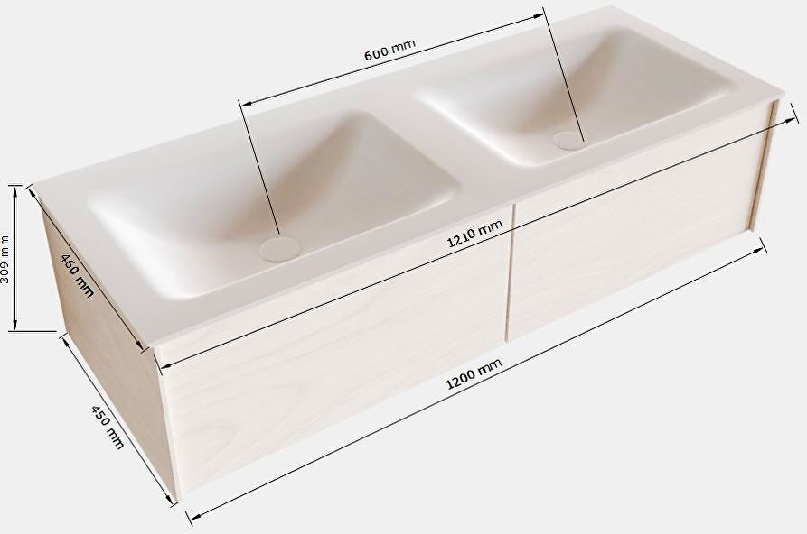 Breedte onderkast: ca. 120 cm Hoogte onderkast: ca. 30 cm Diepte onderkast: ca. 45 cm Kleur onderkast: Washed Oak Materiaal onderkast: Melamine Aantal lades: 2 Type geleider: Push to open Kleur wastafel: Talc Materiaal wastafel: Solid surface Positie wasbak: Dubbel Breedte spoelbak: 47 cm Aantal spoelbakken: 2 Aantal kraangaten: 2 Producent: Mondiaz Antibacterieel: Ja Maatwerk mogelijk: Ja Inclusief sifon: Nee Deze badmeubelset is mooi te combineren met: