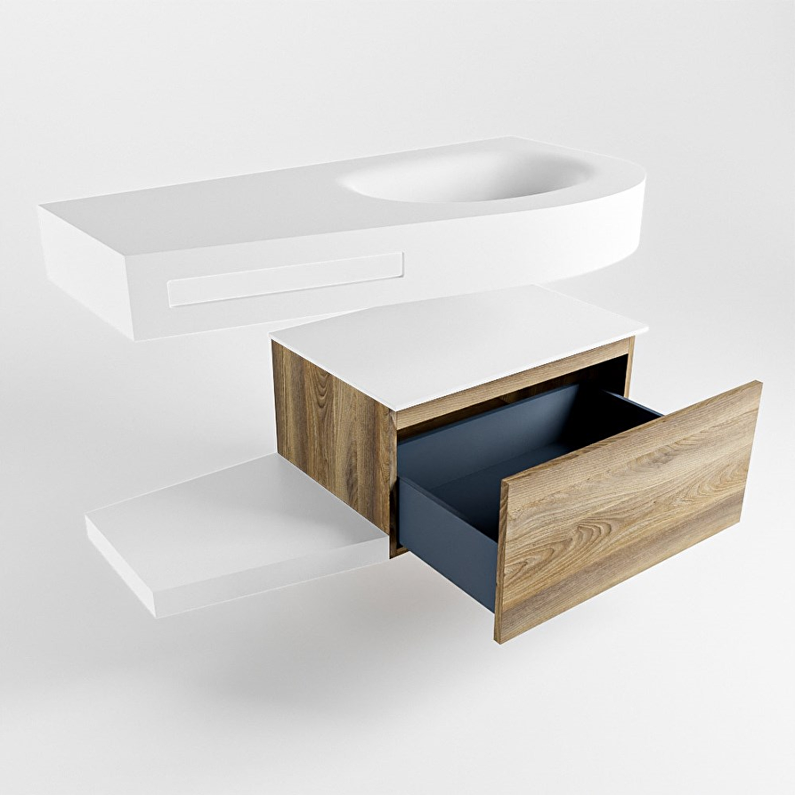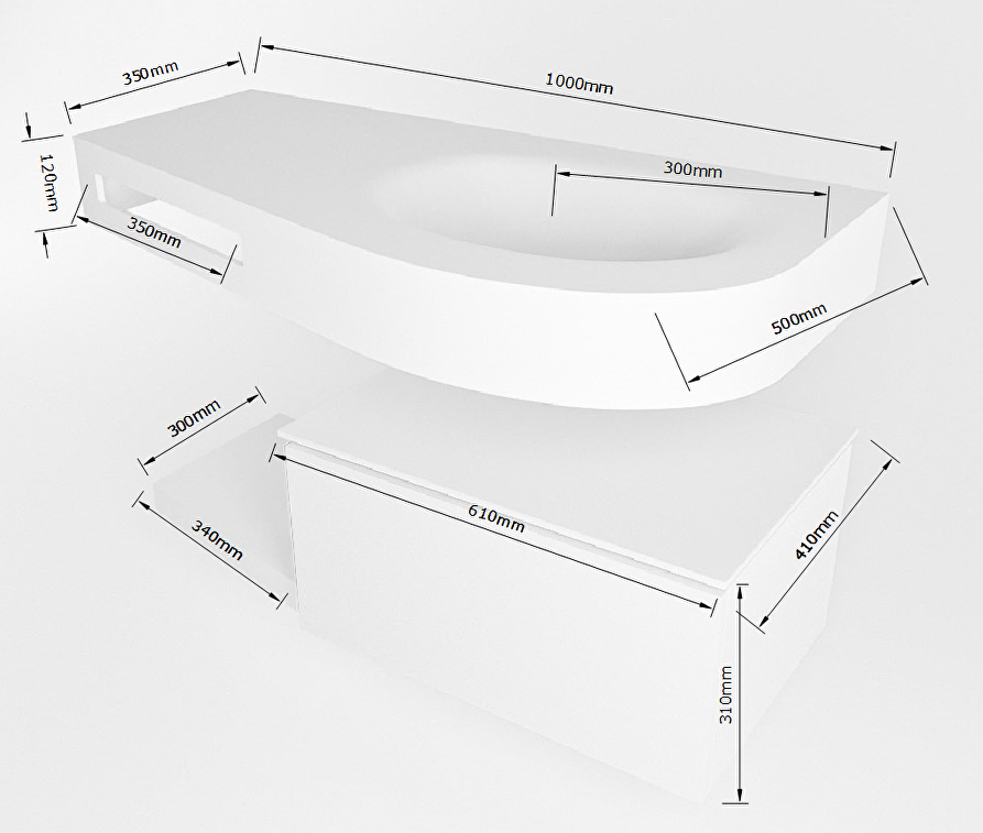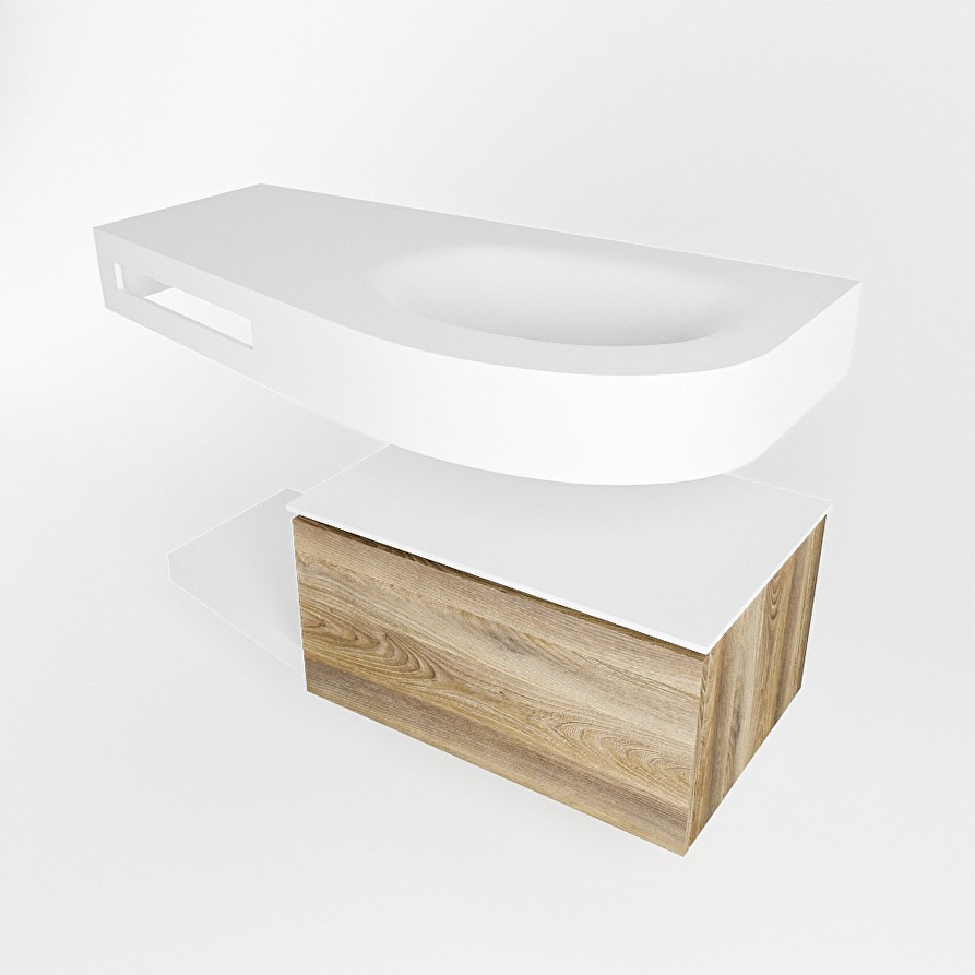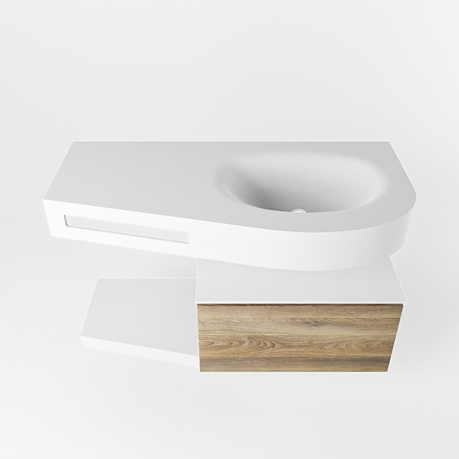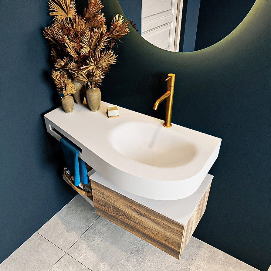 Deze set straalt luxe uit, zowel in een stijlvolle hotelkamer als in je eigen badkamer. Dankzij de unieke vorm van de DULCET-wastafel en de geïntegreerde handdoekhouder, past deze set zelfs in de kleinste badkamers en behoudt daarbij zijn elegante uitstraling. De RIVA badmeubelset bestaat uit een vrij hangende onderkast met één lade, die ruim voldoende opbergruimte biedt. Het bijpassende solid surface planchet heeft dezelfde verfijnde vorm als de wastafel en biedt een elegante plek voor je mooiste badkamerproducten.