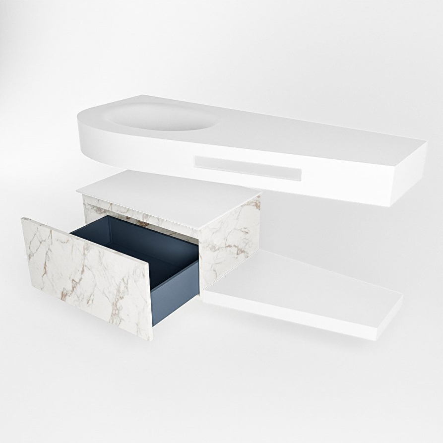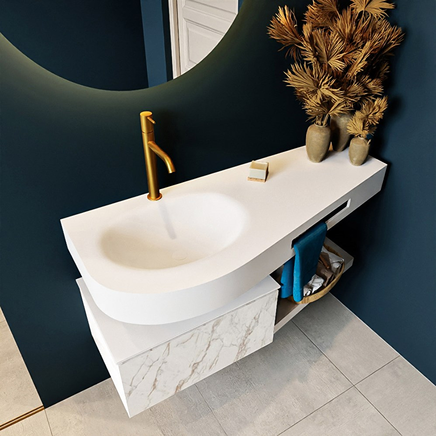 Deze set is niet alleen een prachtige aanvulling in een luxe hotelkamer, maar kan ook een fantastische blikvanger zijn in jouw eigen badkamer. De bijzondere vorm van de DULCET-wastafel en de geïntegreerde handdoekhouder zorgen ervoor dat zelfs in een kleinere badkamer je kunt genieten van een chique hoteluitstraling. Het badmeubel op de afbeelding is de RIVA badkamermeubel met onderkast. De RIVA heeft een vrij hangende onderkast met één lade, waarin voldoende ruimte is voor al je badkamerartikelen. Het solid surface planchet volgt dezelfde elegante lijnen als de wastafel en biedt een stijlvol platform voor je mooiste badkamerproducten.