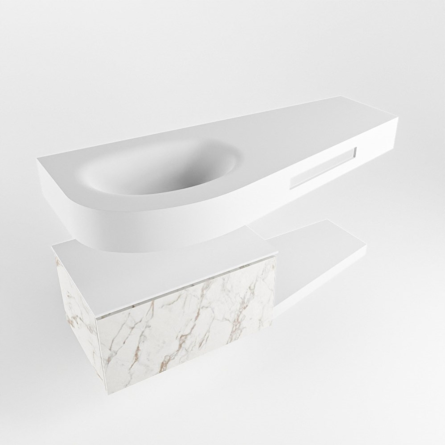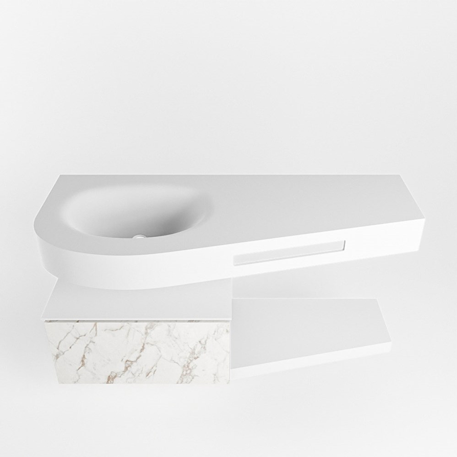 Breedte onderkast: ca. 61 cm Hoogte onderkast: ca. 31 cm Diepte onderkast: ca. 41 cm Breedte planchet: ca. 54 cm Kleur onderkast: Carrara Materiaal onderkast: Melamine Aantal lades: 1 Type geleider: Push to open Breedte wastafel: 120 cm Hoogte wastafel: 12 cm Diepte wastafel: 50 cm Kleur wastafel: Talc Materiaal wastafel: Solid surface Positie wasbak: Links Breedte spoelbak: 47 cm Aantal spoelbakken: 1 Aantal kraangaten: 1 Producent: Mondiaz Antibacterieel: Ja Maatwerk mogelijk: Ja Inclusief sifon: Nee Deze badmeubelset is mooi te combineren met:
