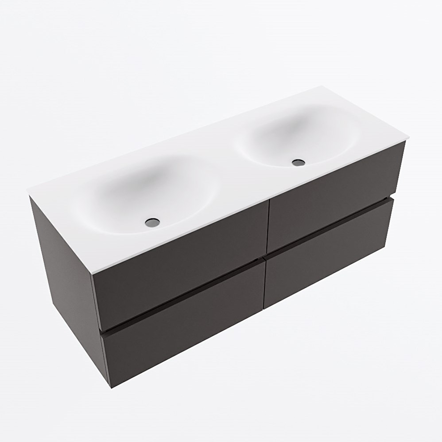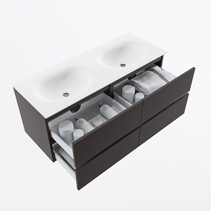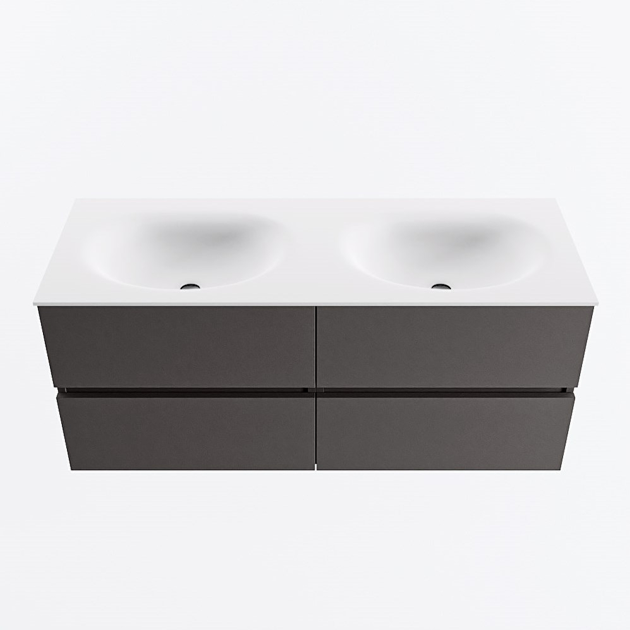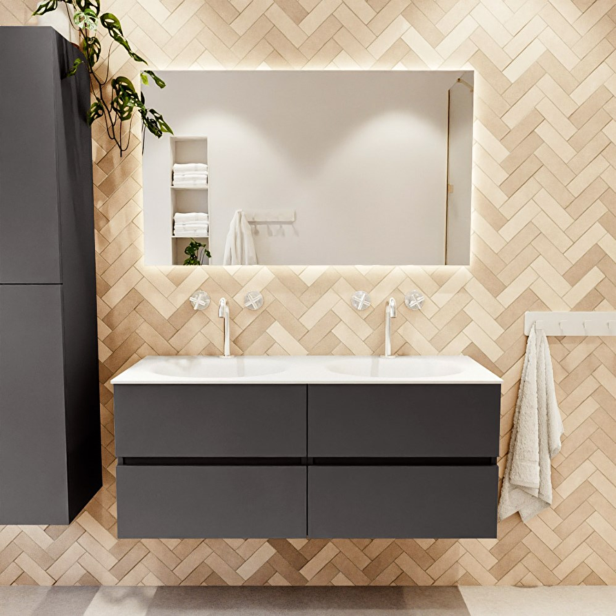 Breedte onderkast: ca. 120 cm Hoogte onderkast: ca. 50 cm Diepte onderkast: ca. 45 cm Kleur onderkast: Dark Grey Materiaal onderkast: MDF Aantal lades: 4 Type geleider: Softclose Breedte wastafel: 121 cm Hoogte wastafel: 0,9 cm Diepte wastafel: 46 cm Kleur wastafel: Talc Materiaal wastafel: Solid surface Positie wasbak: Dubbel Breedte spoelbak: 47 cm Aantal spoelbakken: 2 Aantal kraangaten: 2 Producent: Mondiaz Antibacterieel: Ja Maatwerk mogelijk: Ja Inclusief sifon: Nee Deze badmeubelset is mooi te combineren met:
