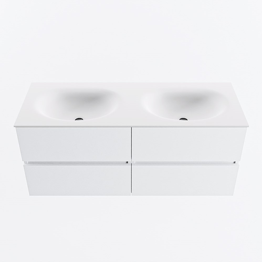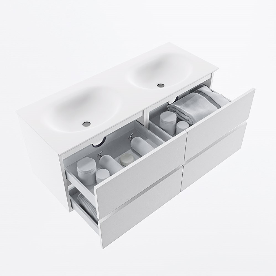 Breedte onderkast: ca. 120 cm Hoogte onderkast: ca. 50 cm Diepte onderkast: ca. 45 cm Kleur onderkast: Talc Materiaal onderkast: MDF Aantal lades: 4 Softclose lades Wastafel breedte: 121 cm Wastafel hoogte: 0,9 cm Wastafel diepte: 46 cm Kleur wastafel: Talc Materiaal wastafel: Solid Surface Positie wasbak: Dubbel Breedte spoelbak: 47 cm Aantal spoelbakken: 2 Aantal kraangaten: 2 Producent: Mondiaz Antibacterieel: Ja Maatwerk: Ja Inclusief sifon: Nee Deze badmeubelset is mooi te combineren met: