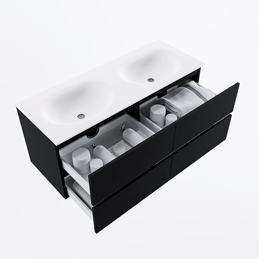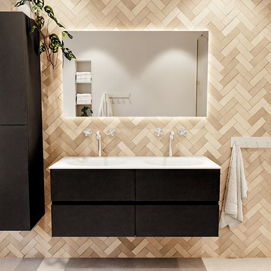 Breedte onderkast: ca. 120 cm Hoogte onderkast: ca. 50 cm Diepte onderkast: ca. 45 cm Kleur onderkast: Urban Materiaal onderkast: MDF Aantal lades: 4 Type geleider: Softclose Breedte wastafel: 121 cm Hoogte wastafel: 0,9 cm Diepte wastafel: 46 cm Kleur wastafel: Talc Materiaal wastafel: Solid Surface Positie wasbak: Dubbel Breedte spoelbak: 47 cm Aantal spoelbakken: 2 Aantal kraangaten: 2 Producent: Mondiaz Antibacterieel: Ja Maatwerk mogelijk: Ja Inclusief sifon: Nee Deze badmeubelset is mooi te combineren met: