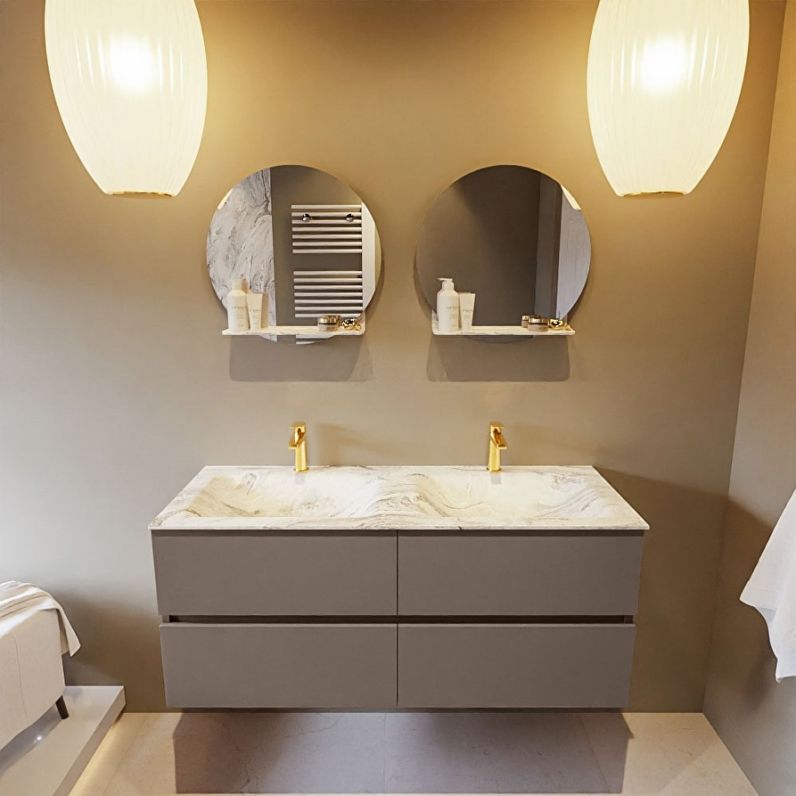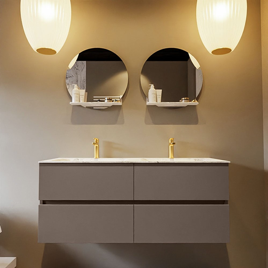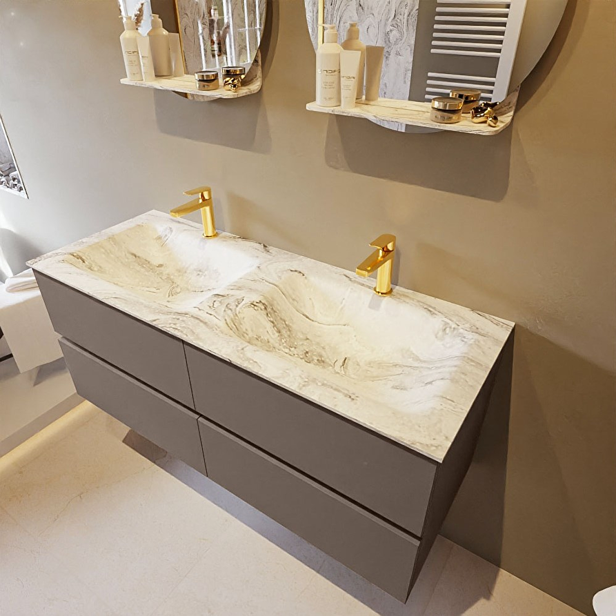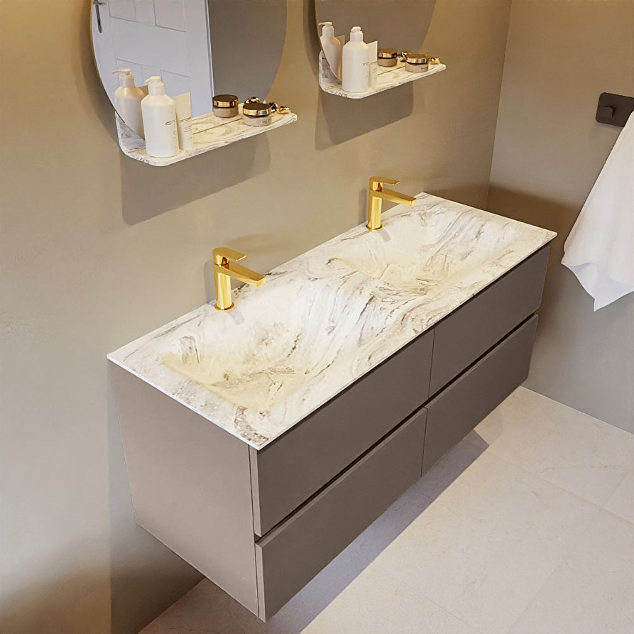 De buitengewone badmeubelset VICA-DLUX is een schitterend pronkstuk voor uw badkamer. De gemarmerde Solid Surface wastafel van CORIAN heeft een fraaie en tijdloze uitstraling. Dankzij de zachte en natuurlijke vorm van de wastafel, in combinatie met de elegante onderkast, past de VICA-DLUX perfect bij diverse badkamerstijlen. Om uw badkamer compleet af te stylen, zijn ook de nissen en spiegelhouders in dezelfde kleur als de wastafel beschikbaar, zoals de Mondiaz nissen en spiegelplanchetten.