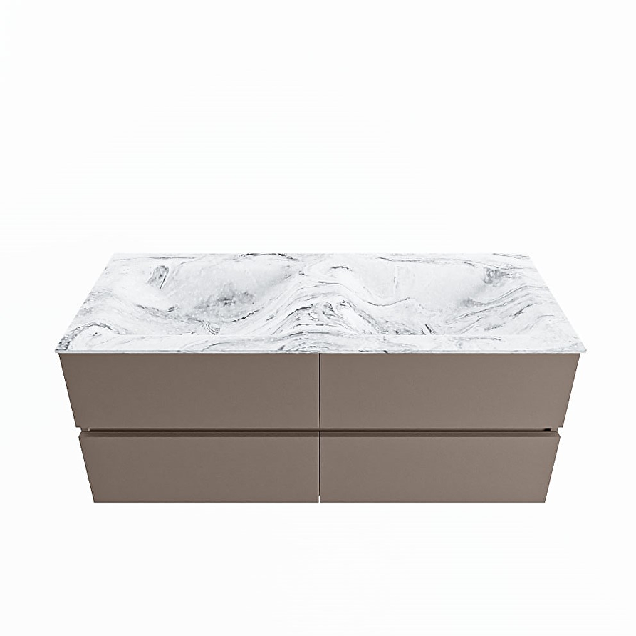 Breedte onderkast: ca. 120 cm Hoogte onderkast: ca. 50 cm Diepte onderkast: ca. 45 cm Kleur onderkast: Smoke Materiaal onderkast: MDF Aantal lades: 4 Type geleider: Softclose Breedte wastafel: 121 cm Hoogte wastafel: 1,2 cm Diepte wastafel: 46 cm Kleur wastafel: Glace Materiaal wastafel: Solid Surface Positie wasbak: Dubbel Breedte spoelbak: 47 cm Aantal spoelbakken: 2 Aantal kraangaten: 2 Producent: Mondiaz Antibacterieel: Ja Maatwerk mogelijk: Ja Inclusief sifon/plug: Nee Deze badmeubelset is mooi te combineren met: