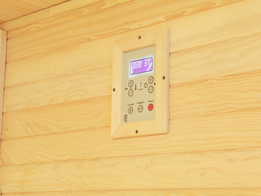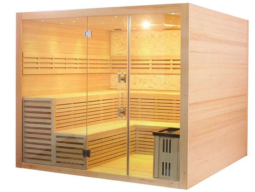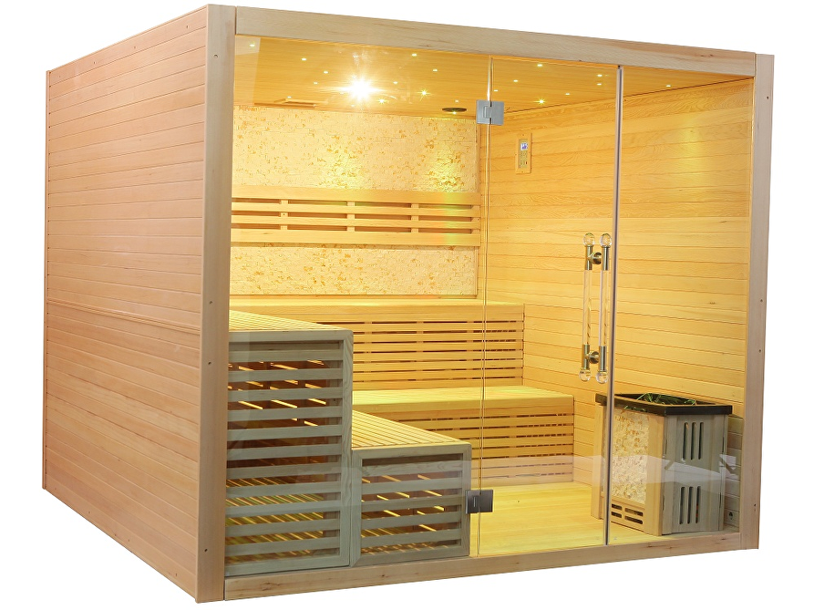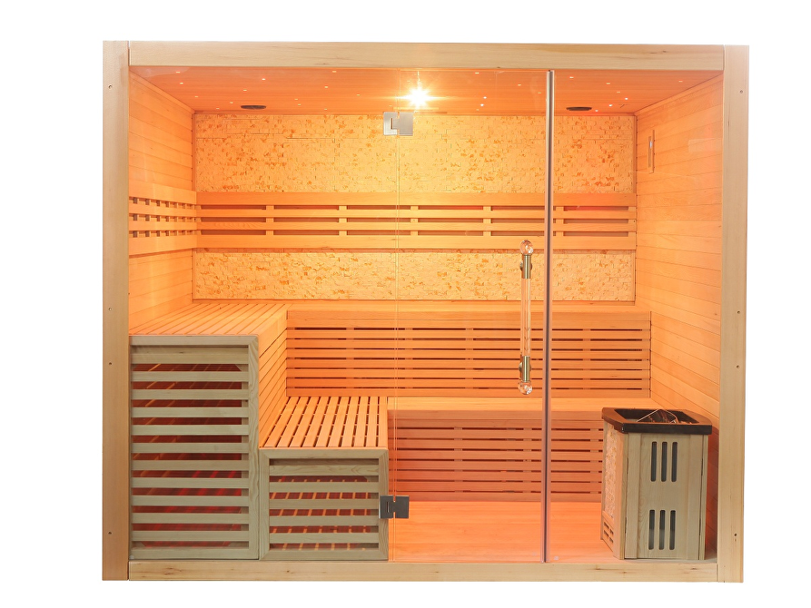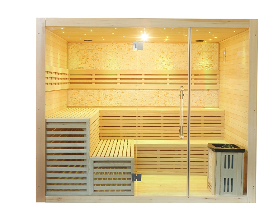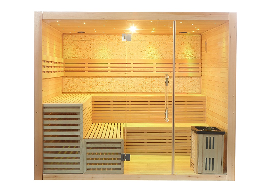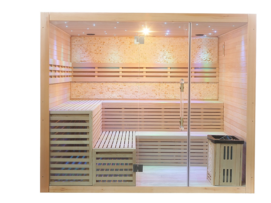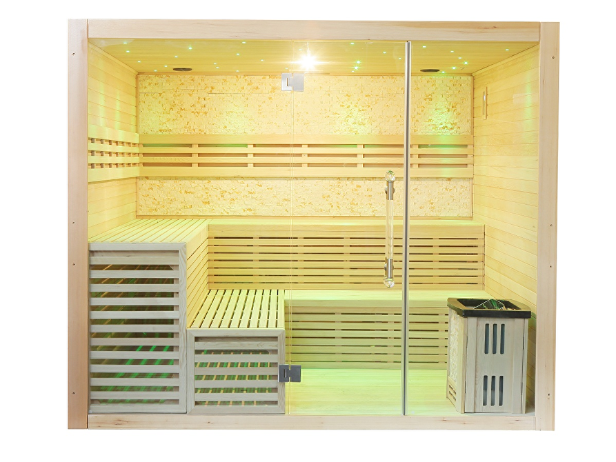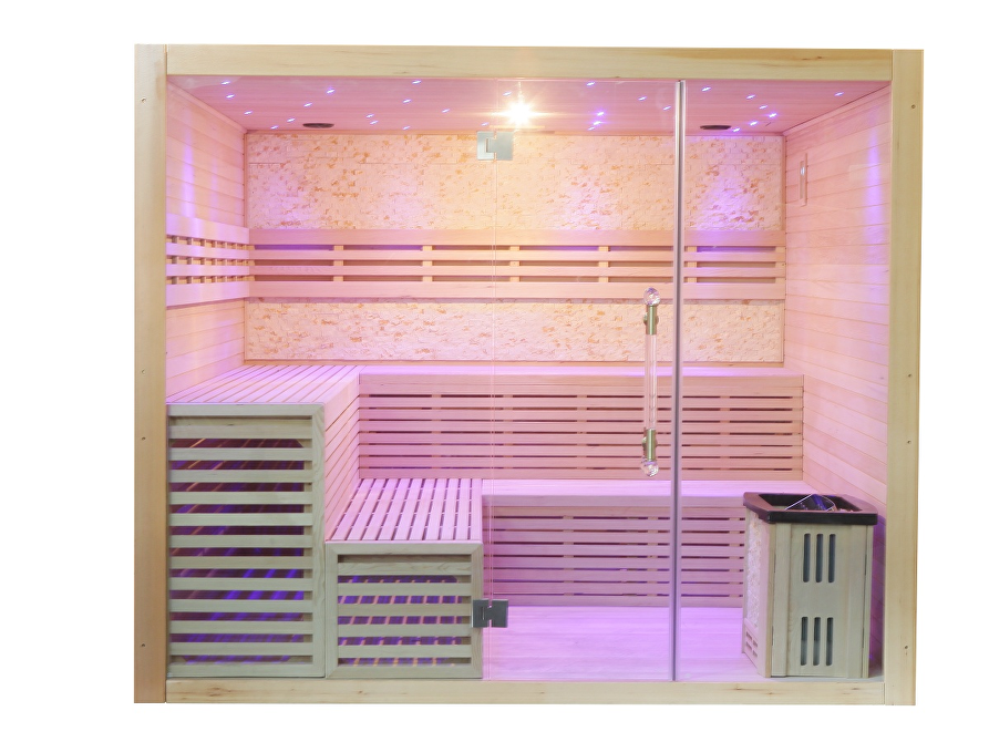• Voorzien van: Helder veiligheidsglas (8mm) - Hittebestendige deurknoppen - Ca. 15 kg. Lavastenen  - Ventilatierooster - Touchscreen Control Panel - Bluetooth integratie voor muziek met dubbele speaker (eenvoudig te bedienen via de Control Panel) - 3 Comfortabele zit/ligbanken - Houten emmer met scheplepel - Zandloper - Thermometer - Let op: Exclusief verlichting in de achterwand.