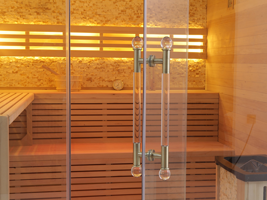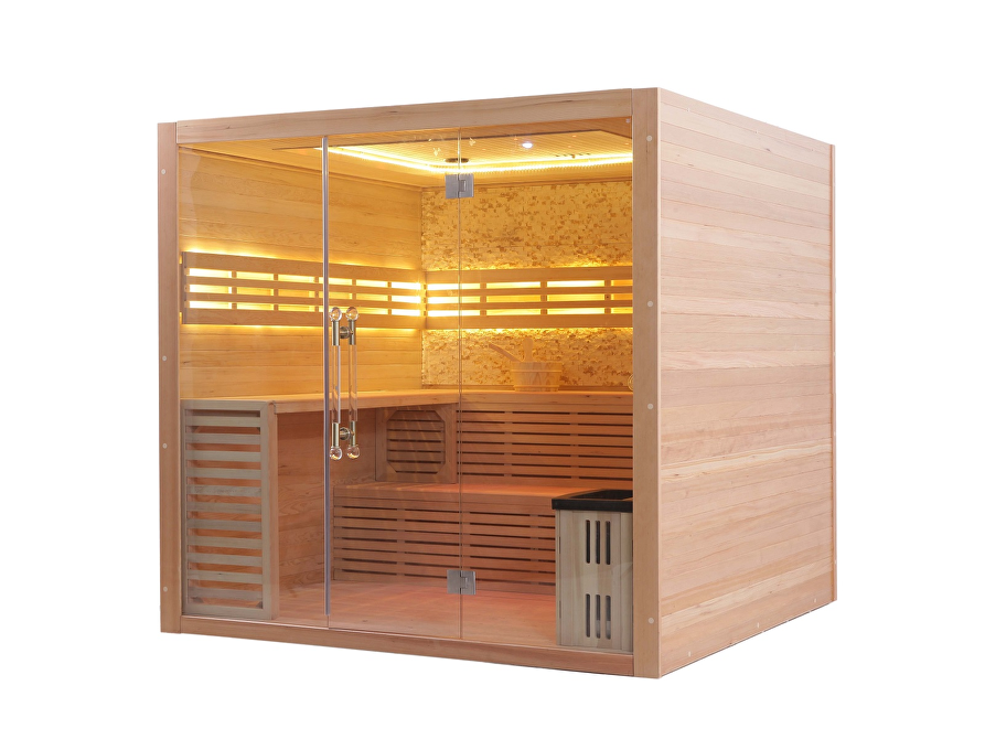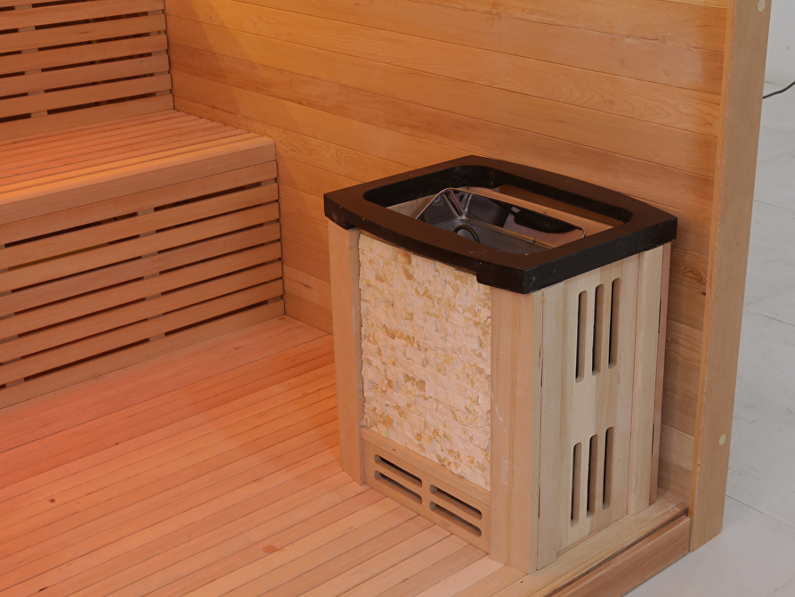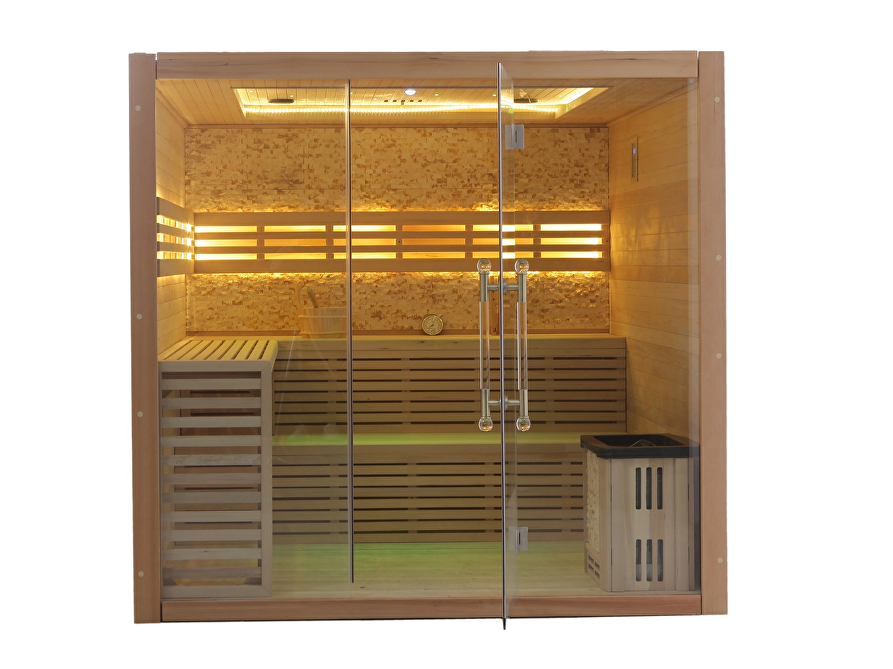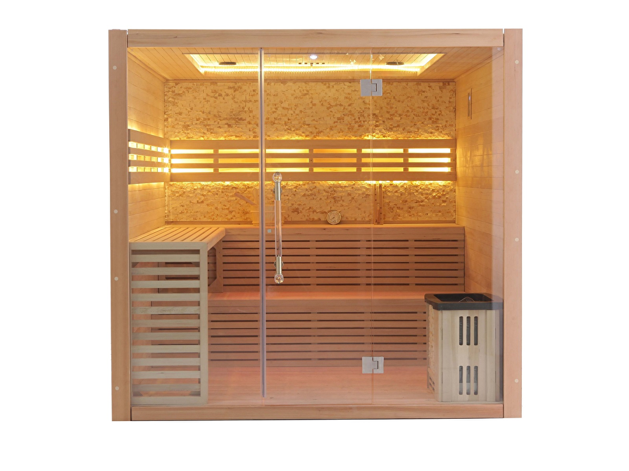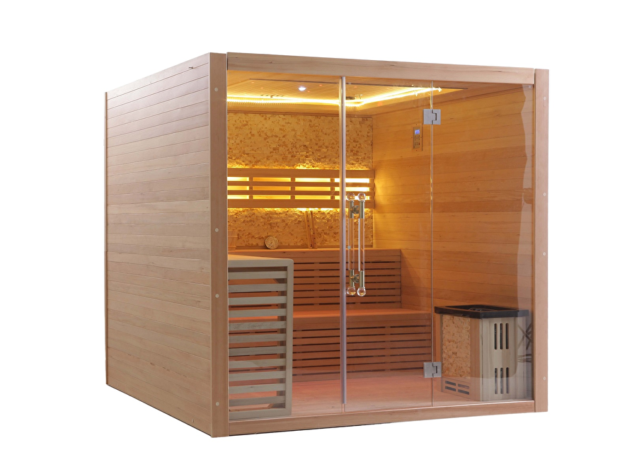 • Voorzien van: Helder veiligheidsglas (8mm) - Hittebestendige deurknoppen - Ca. 15 kg Lavastenen - Ventilatierooster - Touchscreen Control Panel - Bluetooth integratie voor muziek met dubbele speaker (eenvoudig te bedienen via de Control Panel) - Comfortabele zitbank - Houten emmer met scheplepel - Zandloper - Thermometer.