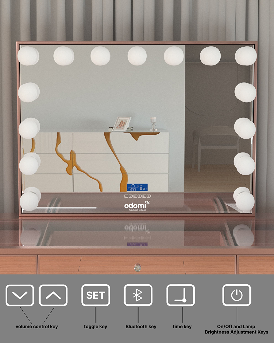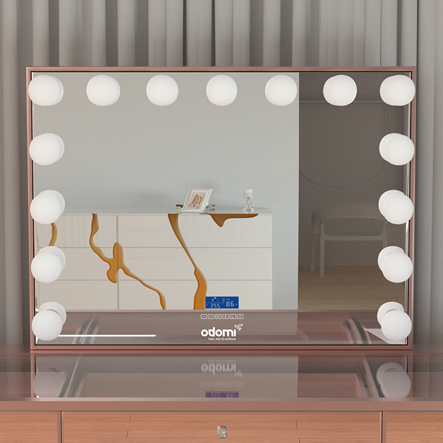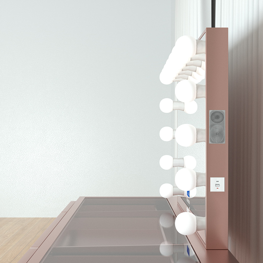 De spiegel is uitgerust met lampen die voor het perfecte licht zorgen tijdens het aanbrengen van jouw make-up. De verlichting heeft drie standen en een dimfunctie. Het licht is met een korte aanraking van de verlichte touchbutton op de spiegel moeiteloos aan en uit te zetten. Door de touchbutton langer aan te raken kan je de helderheid van de verlichting aanpassen. De ingebouwde bleutooth-functie geeft de mogelijkheid om jouw favoriete muziek te luisteren. En ben je vergeten om je telefoon op te laden? Geen probleem! De spiegel heeft een USB- en C-poort.