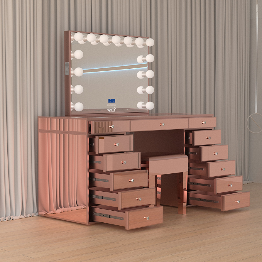 Deze grandioze kaptafel in de kleur Rose Gold Whispers is een must-have voor iedereen die van make-up houdt. Met de Rose Gold Whispers kaptafel breng je de schoonheidssalon naar je slaapkamer. De tafel met 13 lades biedt voldoende ruimte voor al jouw cosmetica en de glazen afwerking van het tafelblad geeft de mogelijkheid om jouw mooiste items ten toon te stellen.