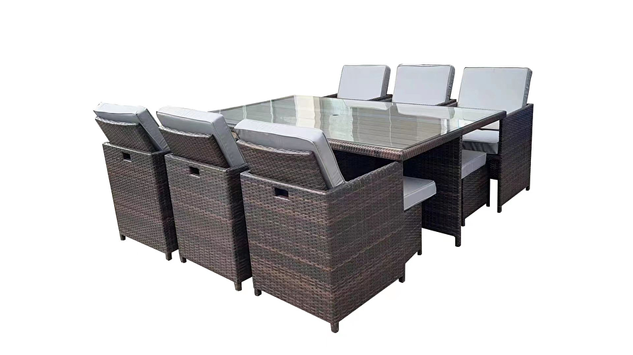 Ontdek de Culinario diningset: een luxueuze 11-delige bruin wicker set met lichtgrijze kussens. Met een gepoedercoat aluminium frame en weerbestendig vlechtwerk, geniet je van hoogwaardige kwaliteit en duurzaamheid. Creëer een stijlvolle en gezellige eetervaring voor jouw gasten.