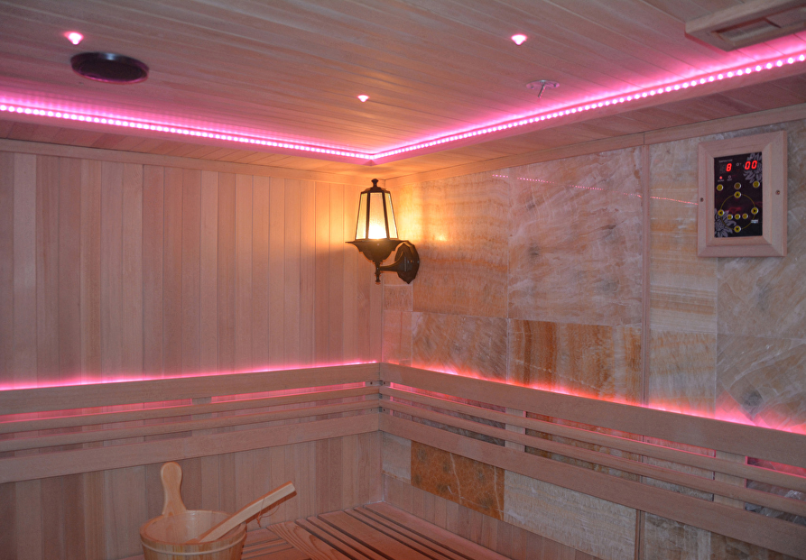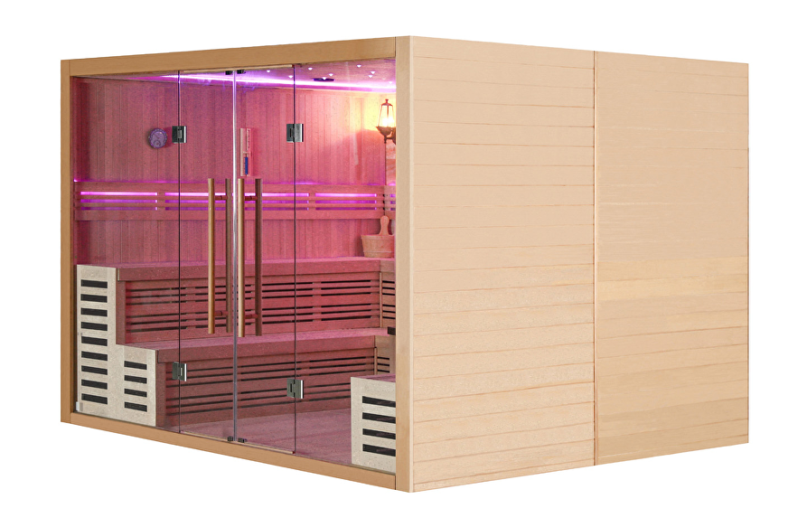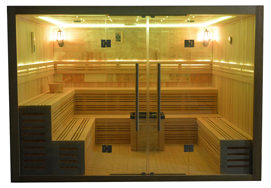 • Voorzien van: Isolatie - Helder veiligheidsglas (8mm) - Hittebestendige deurknoppen - Ca. 20 kg. Lavastenen - Ventilatierooster - Control Panel - Bluetooth integratie voor muziek met dubbele speaker (eenvoudig te bedienen via de Control Panel) - Comfortabele zitbank - Houten emmer met scheplepel - Zandloper – Thermometer – Sfeerverlichting