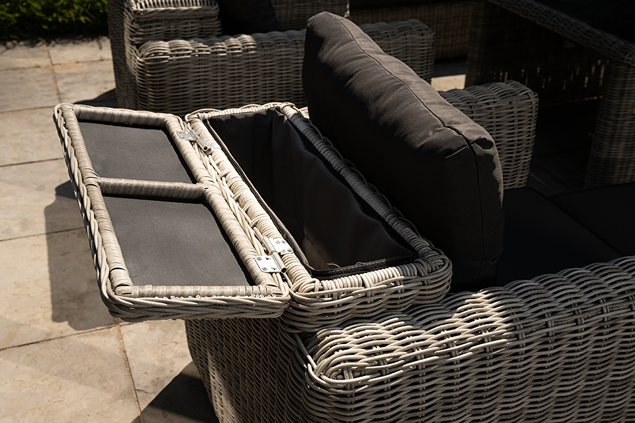 • Kleur: Lichtgrijs rond geweven wicker met donkergrijze kussens